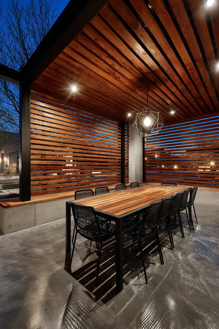 Board-formed concrete panels create textured backdrop wall. This architectural surface adds depth and interest. Polished concrete flooring extends from the interior to exterior. Visual continuity strengthens indoor-outdoor connection.