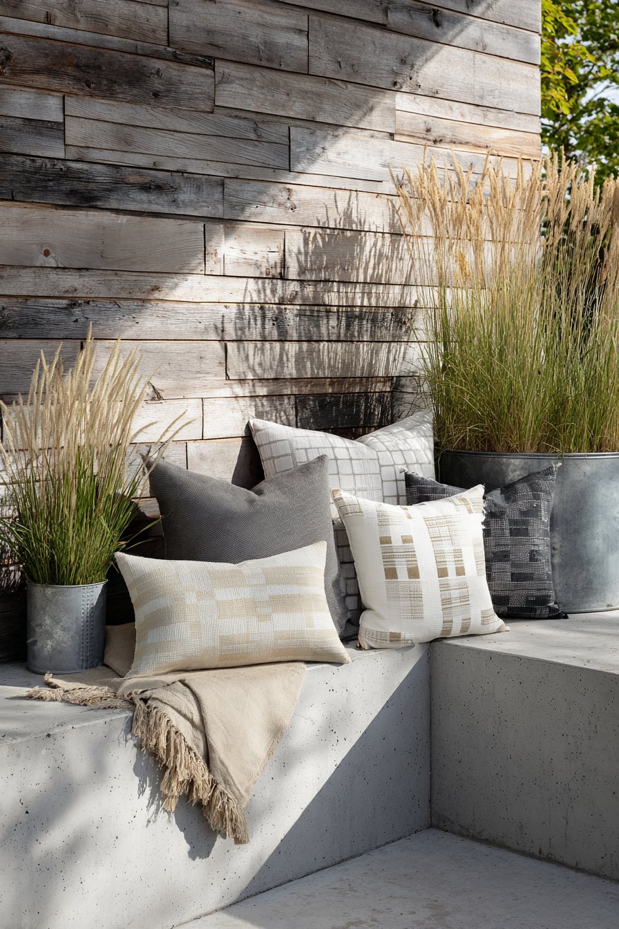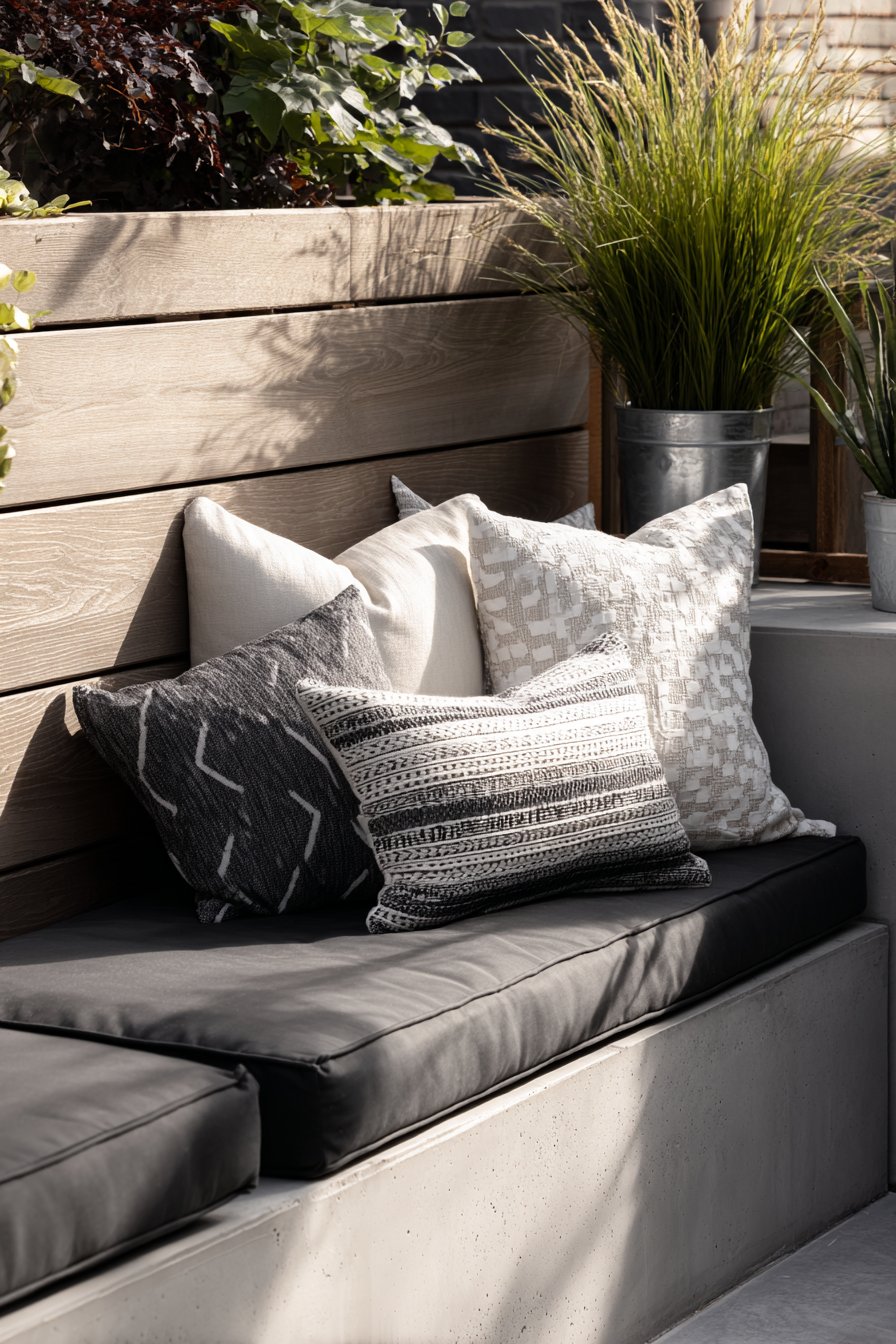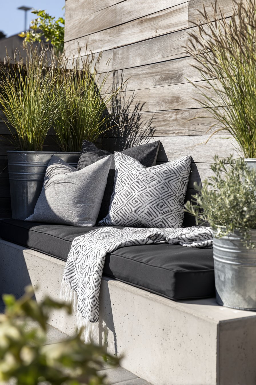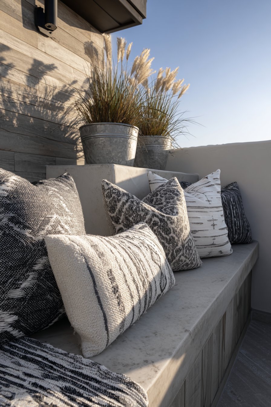Built-in concrete bench receives a thoughtful cushion arrangement. Performance fabrics in a restrained palette create sophistication. Charcoal, white, and natural linen tones coordinate beautifully. Box-edge seat cushions in solid grey provide foundation.