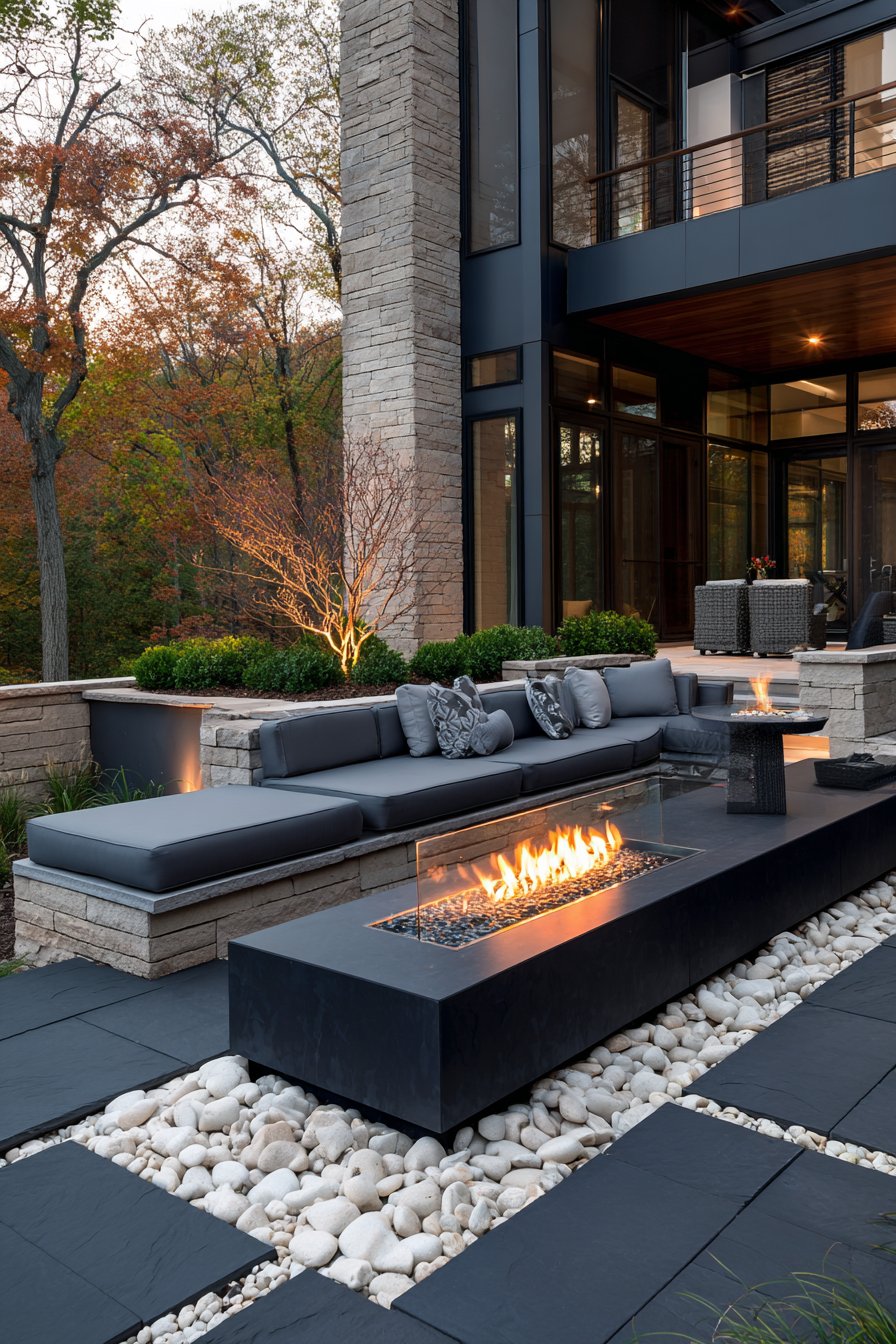 White landscaping stones fill the fire pit interior. These contrast dramatically with surrounding charcoal pavers. Smoke glass wind guard panels contain flames safely. Transparent barriers maintain visual openness while providing protection.