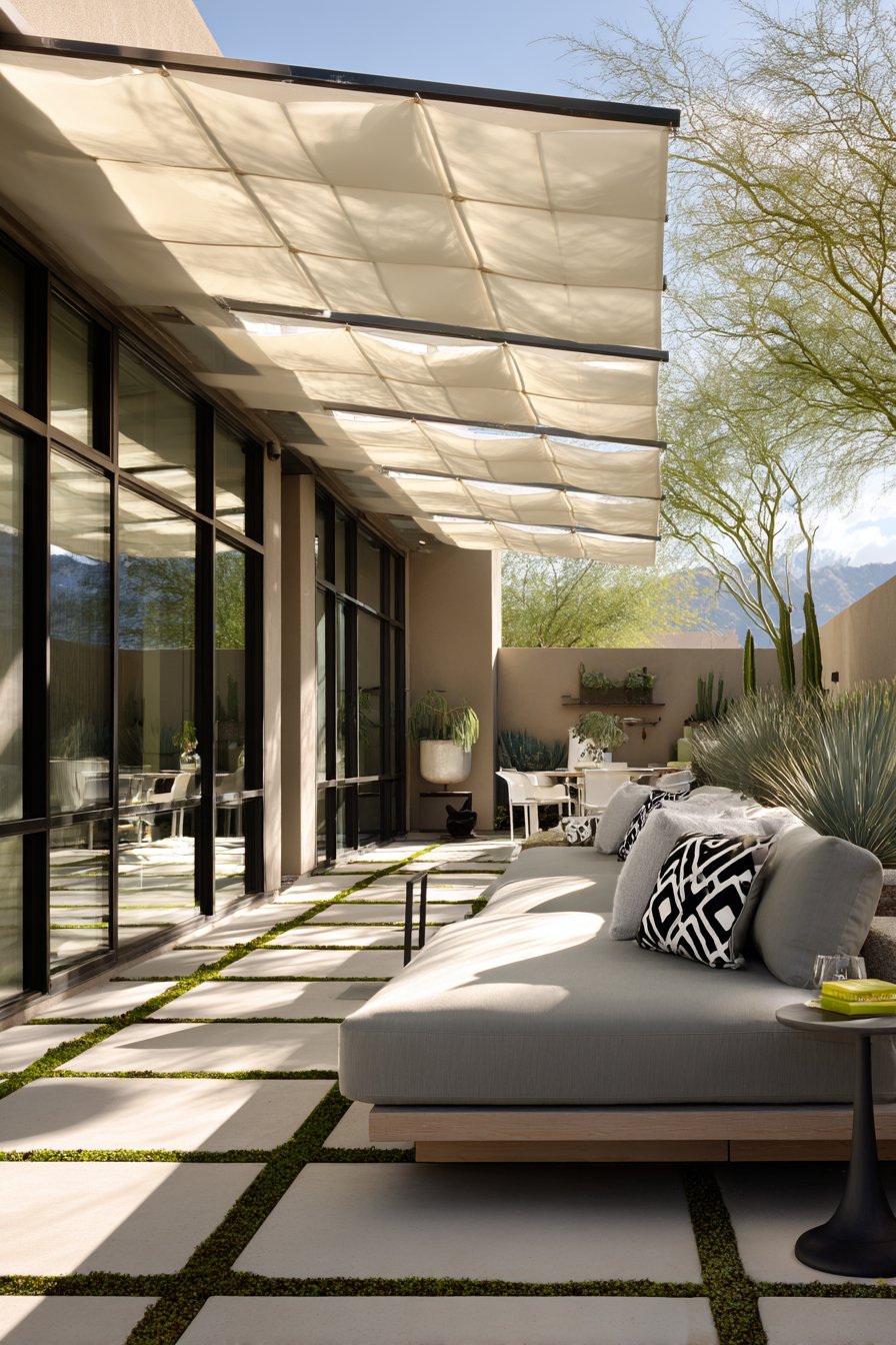 Dynamic shadow patterns change throughout day. This creates ever-evolving visual interest naturally. The design demonstrates functional shade integration. Architectural elements serve purpose while enhancing aesthetics.
