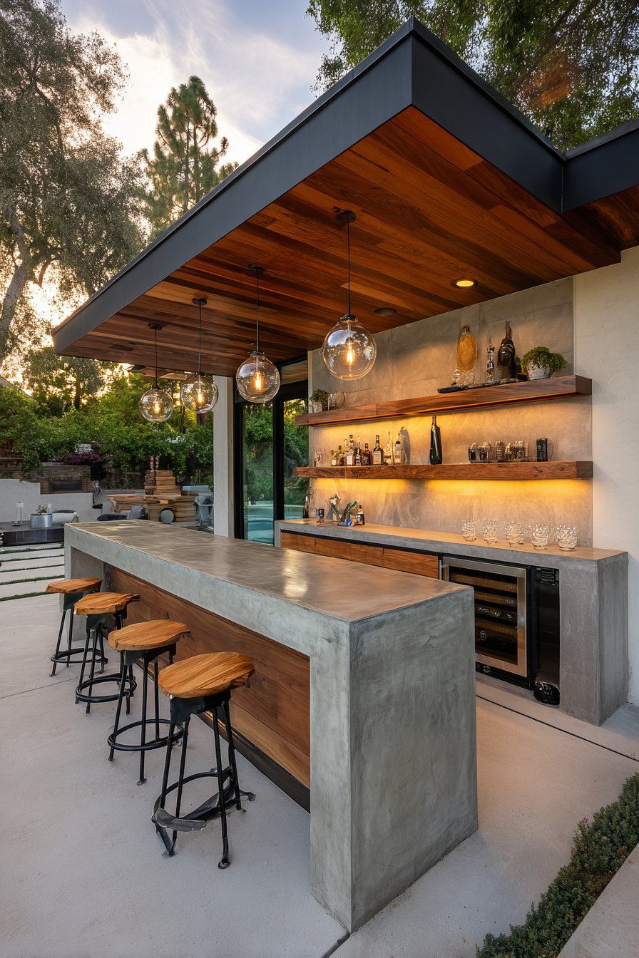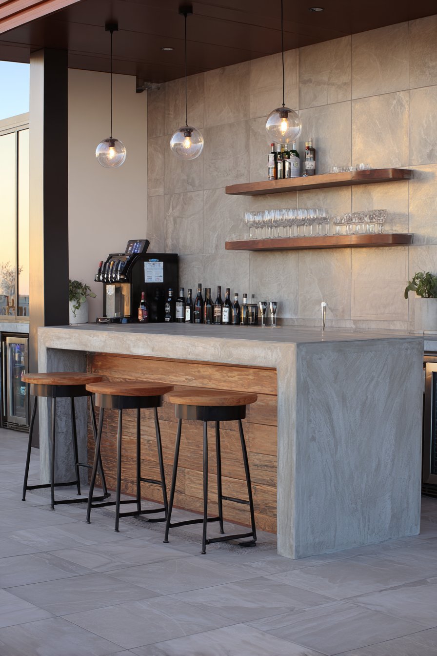 An L-shaped bar counter in polished concrete creates an entertainment hub. Waterfall edge detail showcases material thickness elegantly. Three backless stools feature teak seats and black metal bases. The arrangement encourages casual interaction and conversation.
