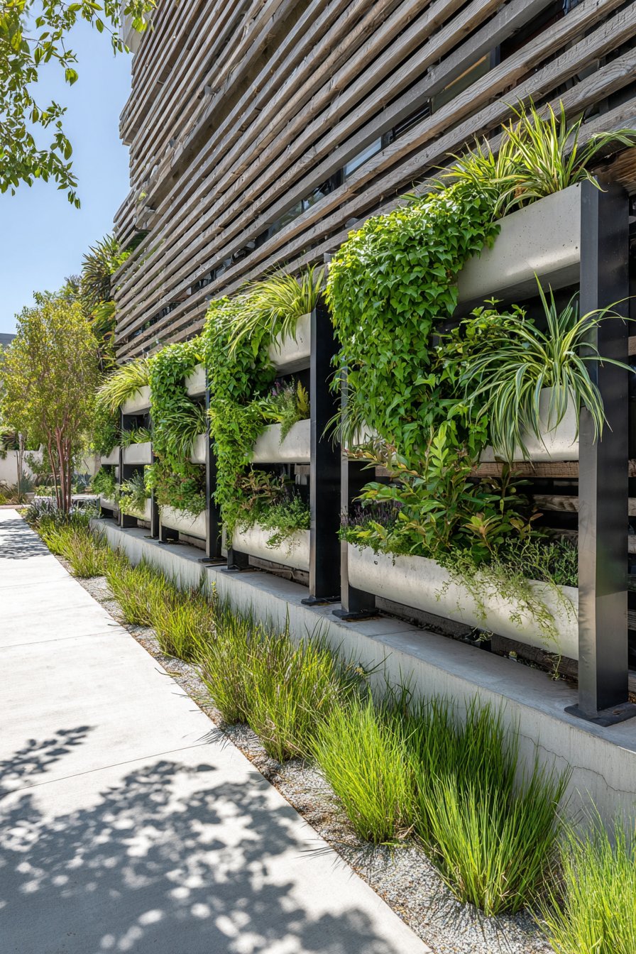 Vertical steel planters create an innovative privacy solution. Cascading greenery forms natural screening without solid barriers. Brushed stainless steel and matte black finishes alternate rhythmically. This pattern adds visual interest to functional element.