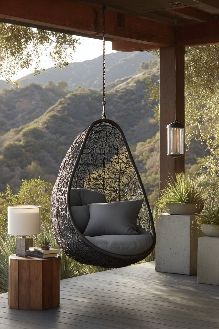 A suspended egg chair creates intimate reading sanctuary. Matte black powder-coated steel frame provides structural support. Grey cushions offer comfort within the cocoon design. The chair hangs from structural wood pergola beam securely.