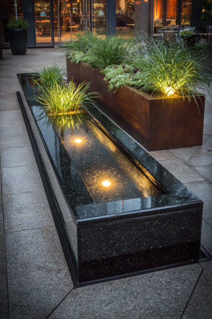 A rectangular reflecting pool demonstrates minimalist sophistication. Black granite coping creates crisp edges and luxury appearance. Still water surface produces mirror-like reflections. The contemplative quality transforms an ordinary garden into meditation space.