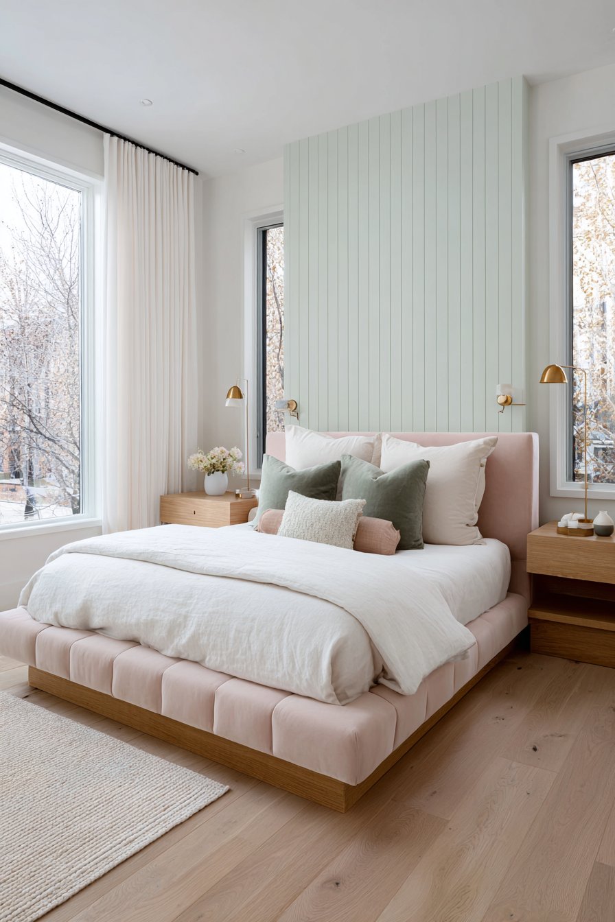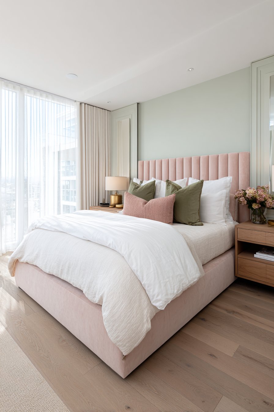 A serene bedroom emerges through the combination of soft blush pink and natural materials. The low-profile upholstered platform bed features a luxurious velvet headboard that becomes the room’s focal point. Crisp white linen bedding creates beautiful contrast against the pink backdrop. Light oak floating nightstands flank the bed with elegant simplicity.