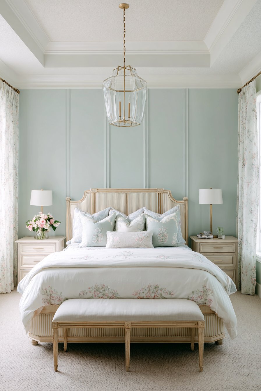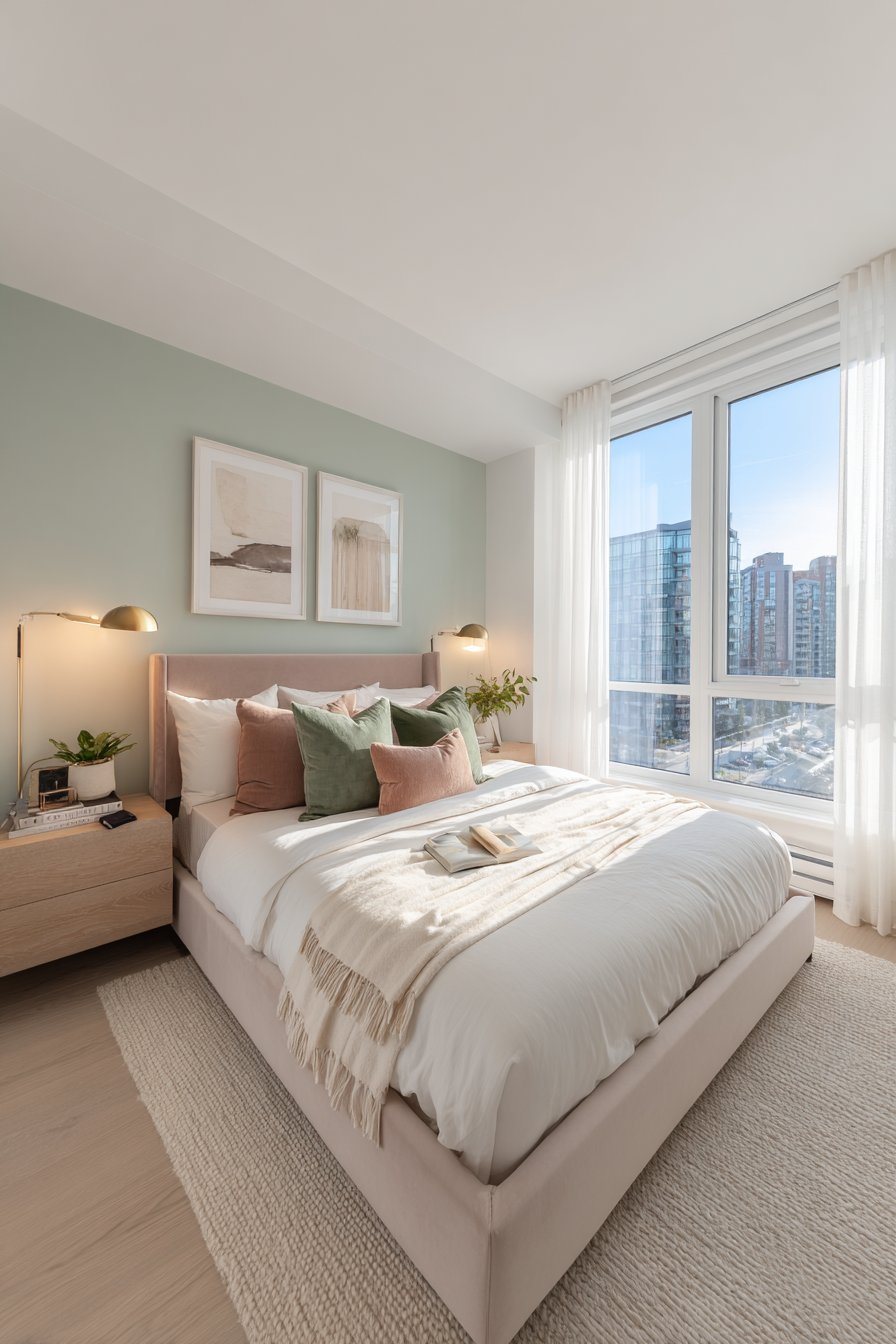 The accent wall behind the bed showcases a gentle mint green paint finish. This unexpected color pairing creates visual interest without overwhelming the senses. Subtle texture in the wall treatment adds dimensional depth. The combination of blush and mint demonstrates how pastels can create sophisticated adult spaces.