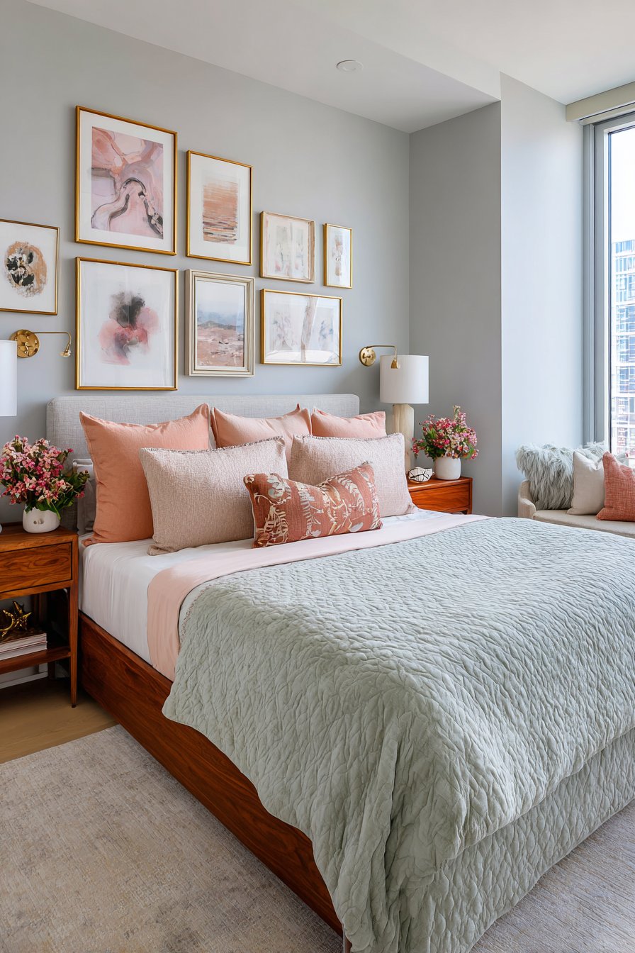 A mid-century modern dresser in natural walnut sits against the sage walls. Ceramic table lamps in muted coral finish tie the color scheme together. Abstract artwork in pastel hues hangs above in simple white frames. Each element supports the room’s cohesive color story.