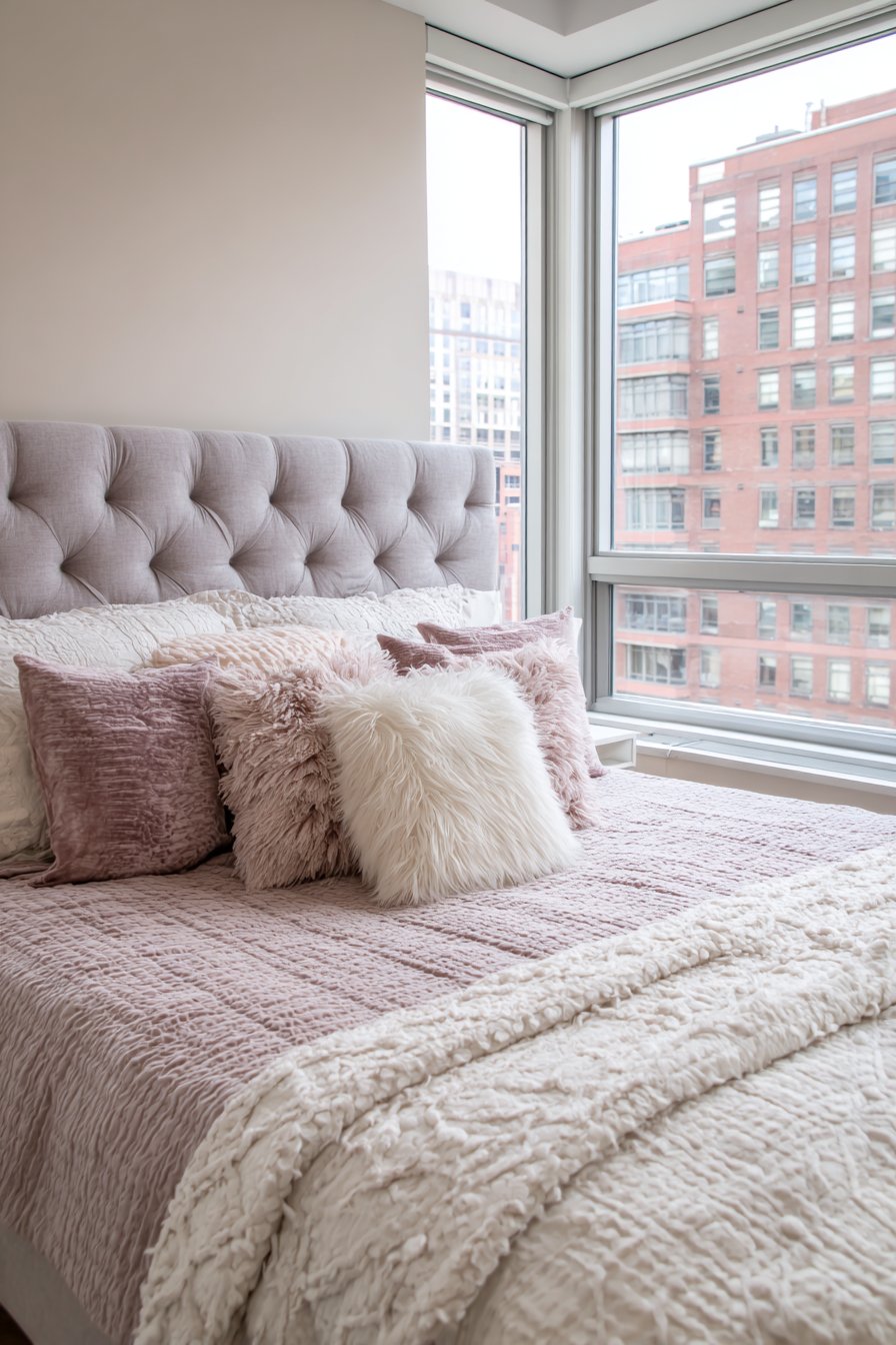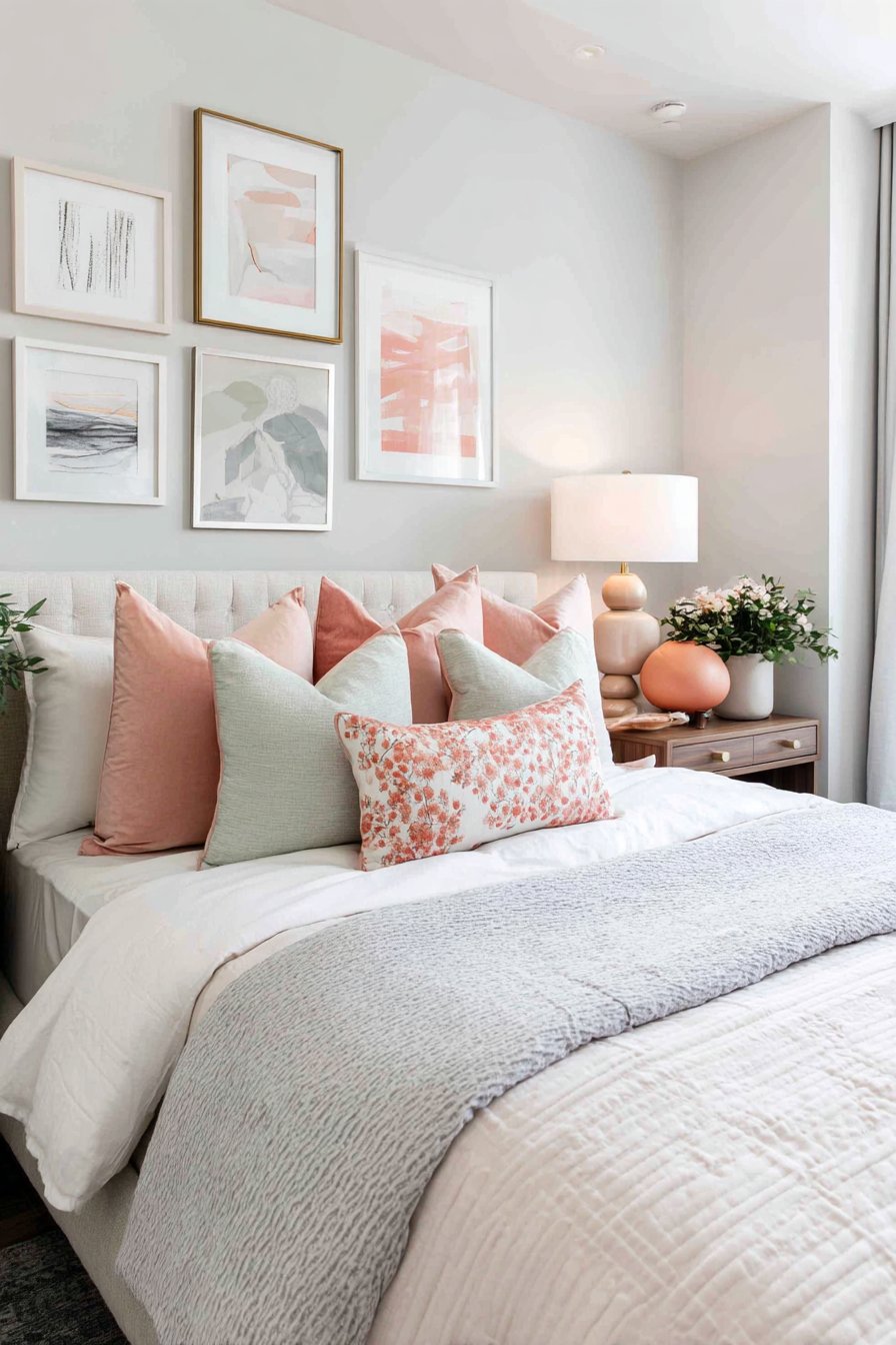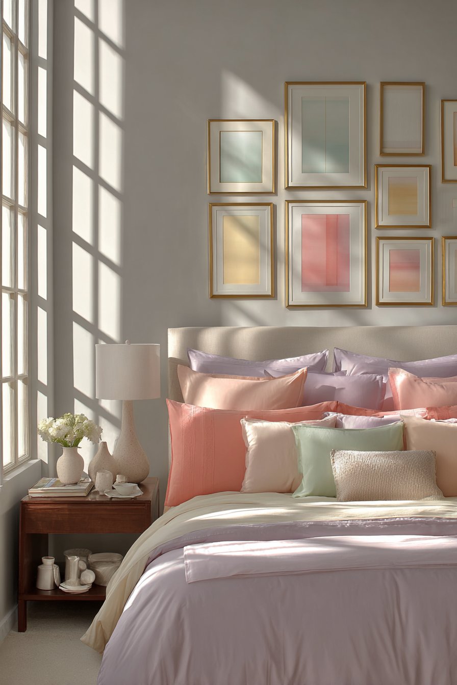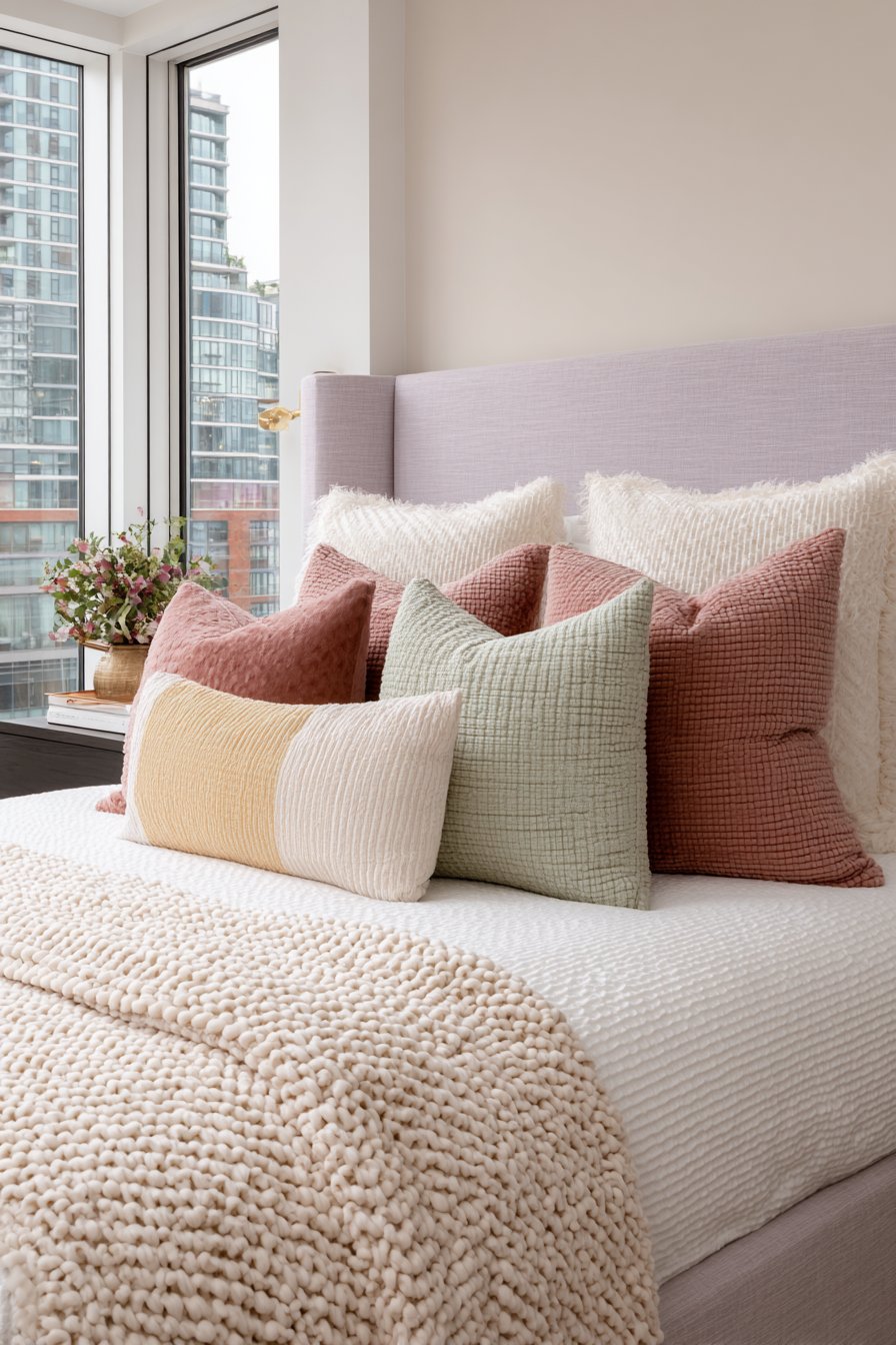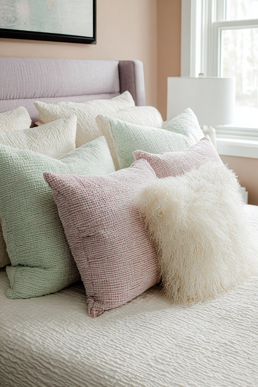 - Layer multiple throw pillows in varied pastel shades and textures