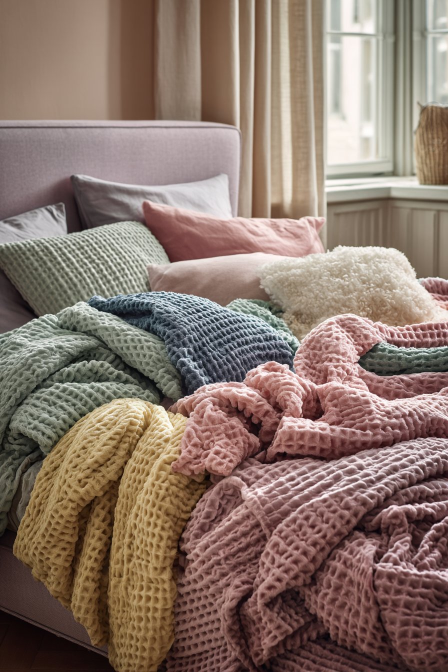 - Layer textured throws in complementary pastel tones
