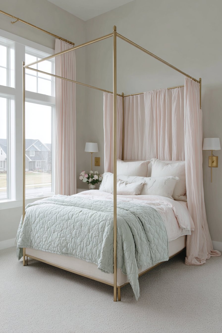 - Select brushed brass fixtures for warm metallic accents that complement pastels