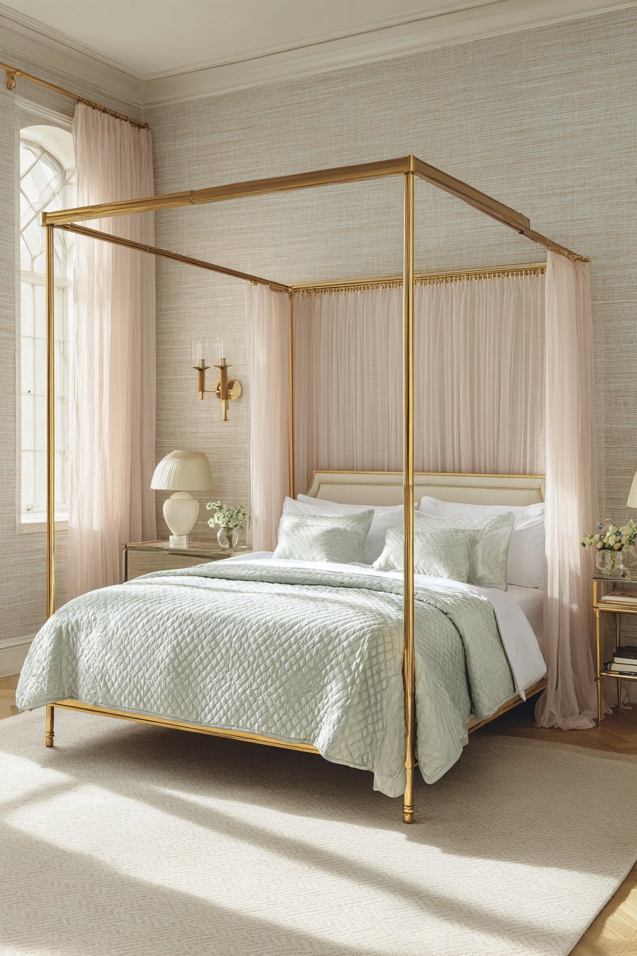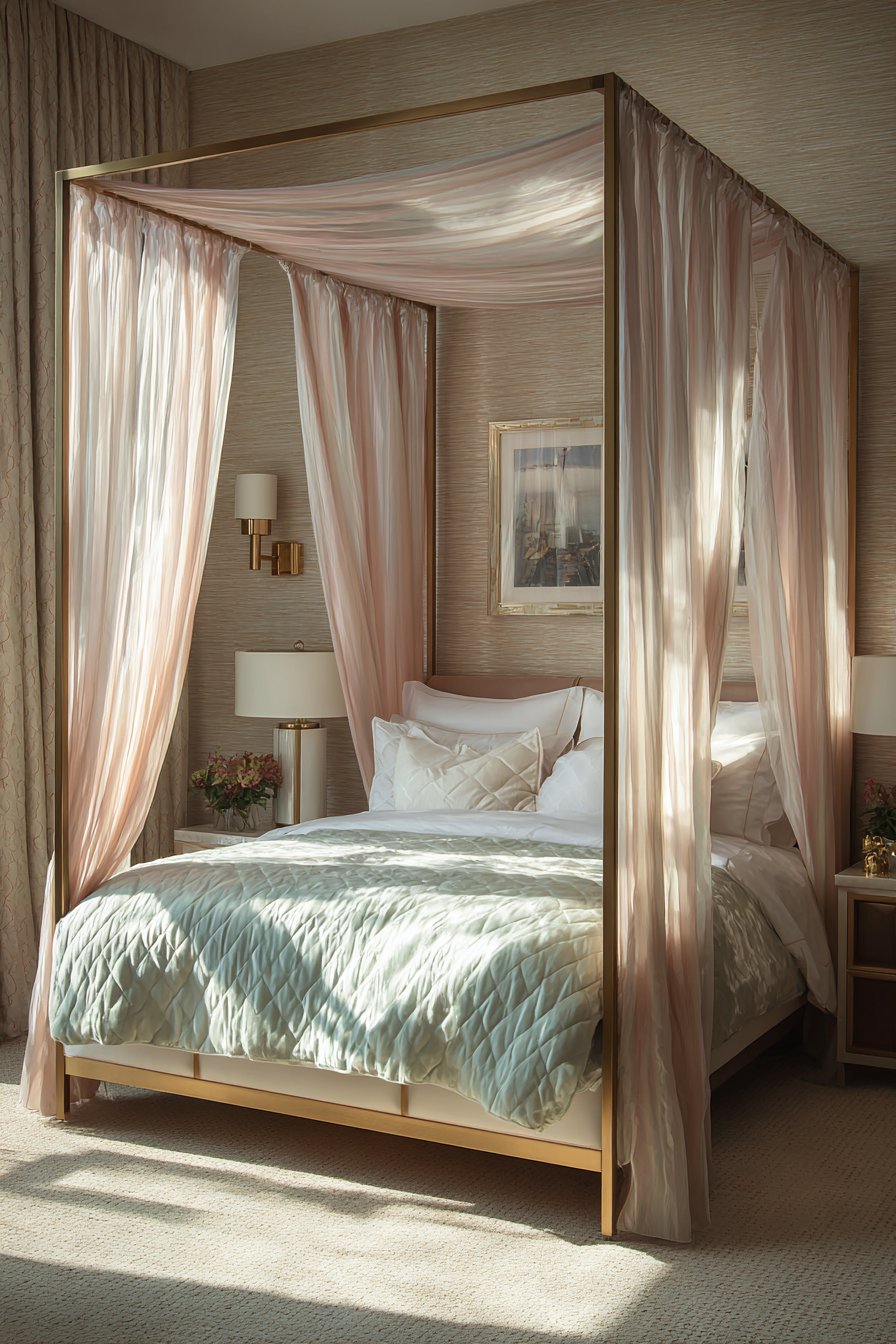 Natural lighting from sheer-curtained windows creates an ethereal quality throughout the space. The room’s symmetry contributes to its peaceful, balanced atmosphere. Each design element receives careful consideration for proportion and placement. The overall effect achieves sophisticated elegance through restraint and refinement.