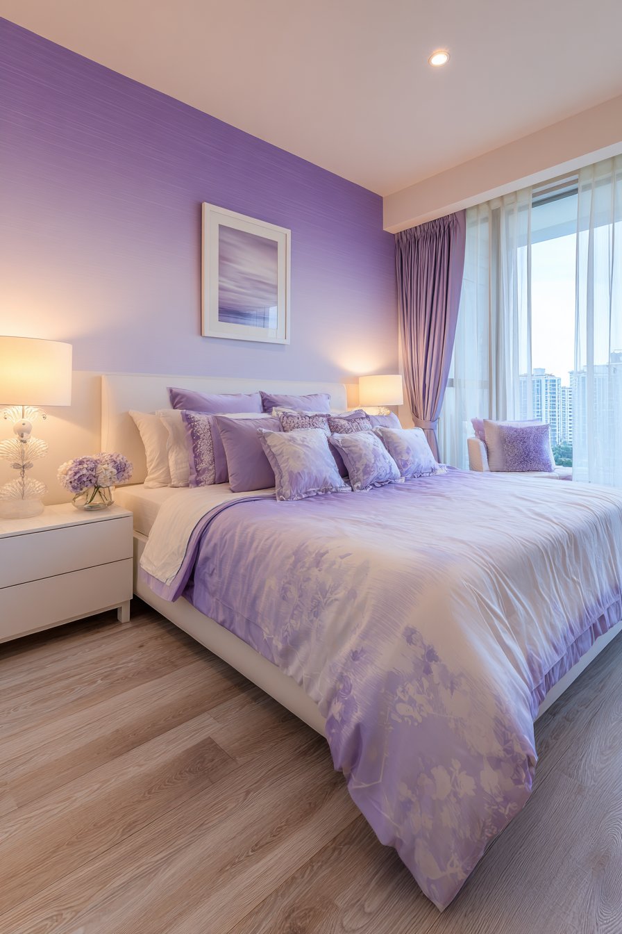 Open shelving above the desk displays books and decorative objects thoughtfully. Each item coordinates with the room’s pastel color scheme. The soft lavender accent wall behind the workspace creates a dedicated zone. This color differentiation helps separate work from rest areas psychologically.