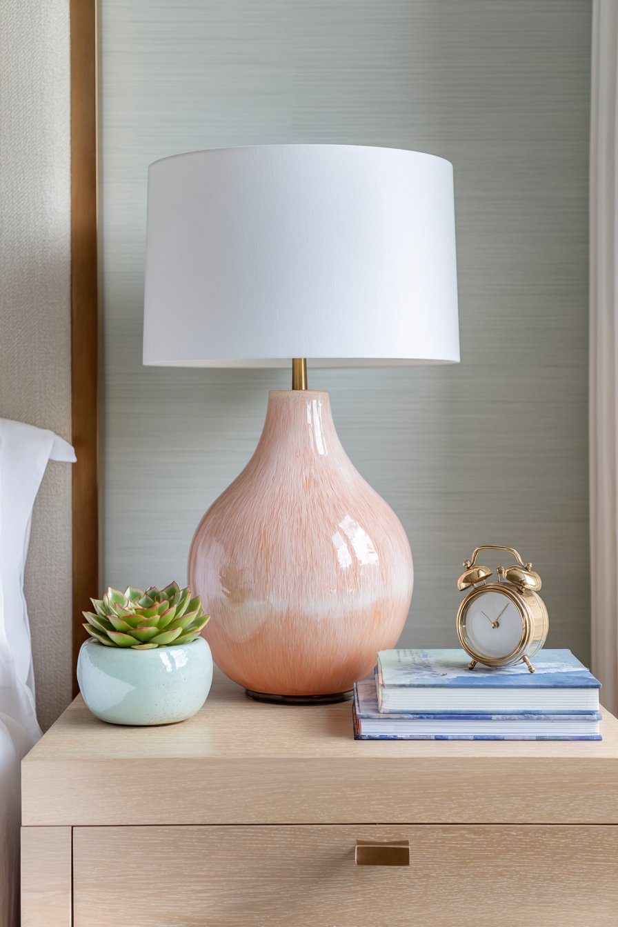 Careful curation transforms functional surfaces into beautiful displays. A contemporary table lamp features a ceramic base glazed in soft coral. The white drum shade provides practical illumination while maintaining clean aesthetics. Light oak nightstand surface offers warm natural backdrop for styled objects.