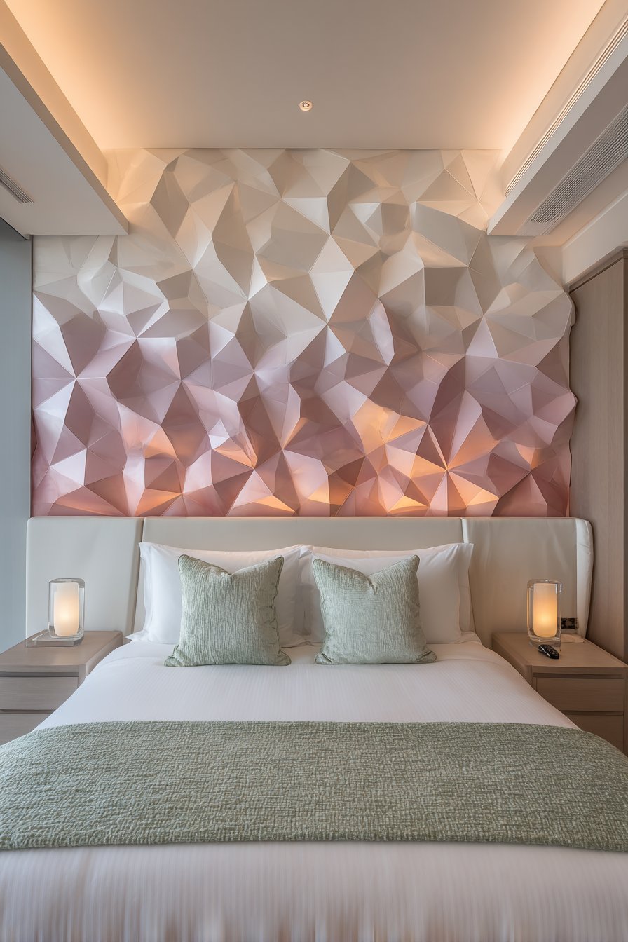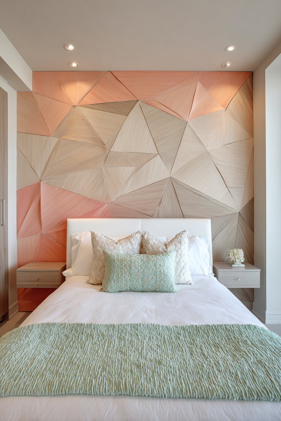 A streamlined bed with white upholstered headboard centers against this feature wall. The neutral headboard allows the architectural wall to command attention. Minimal bedding in crisp white maintains simplicity. One textured throw in complementary mint green adds controlled color accent.