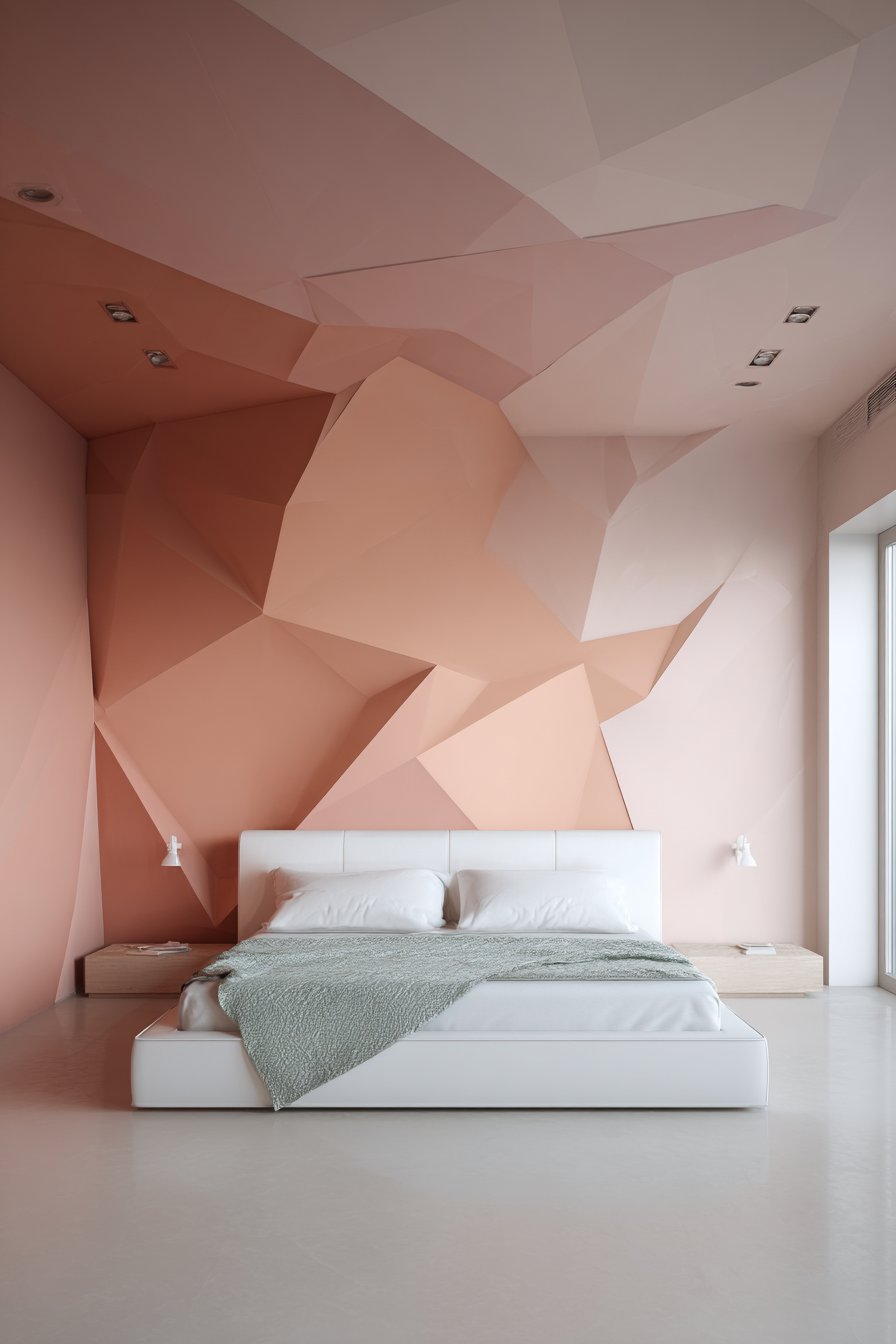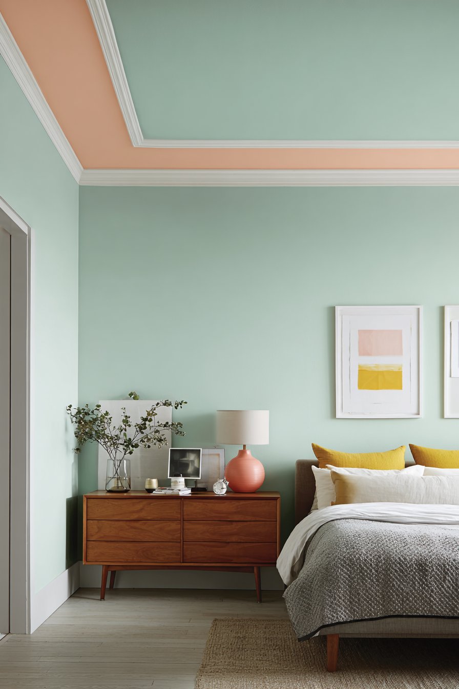 Unexpected color placement creates dramatic impact in this innovative bedroom design. A soft peach tone covers the ceiling with contemporary white geometric molding. This upward color draws the eye and makes the room feel larger. Pale sage green walls below create a soothing two-tone effect.