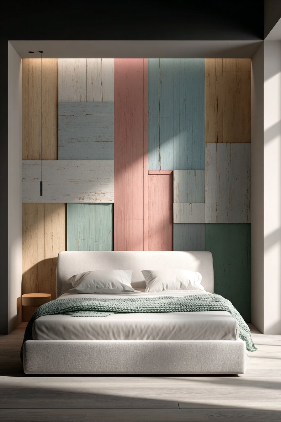 The full height of the headboard creates an architectural impact typically reserved for permanent installations. Yet the furniture-based approach allows flexibility for future changes. Wide-angle perspectives reveal how the vertical emphasis affects spatial perception. Natural window light creates gentle highlights across the varied pastel textiles.