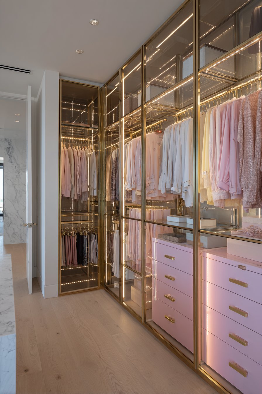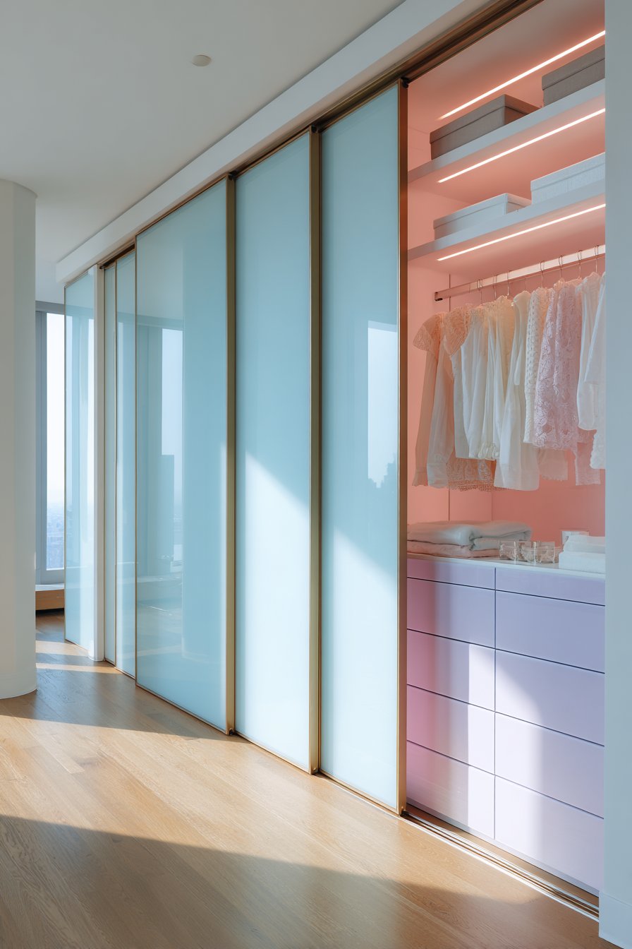 Practical luxury emerges through sophisticated storage design. Frosted glass sliding doors with brushed aluminum frames span one full wall. Soft internal LED lighting reveals organized clothing in pastel tones. The translucent quality creates visual interest while concealing contents partially.