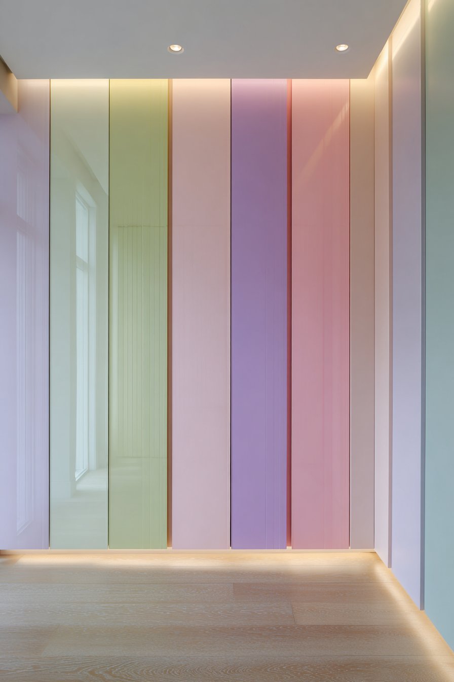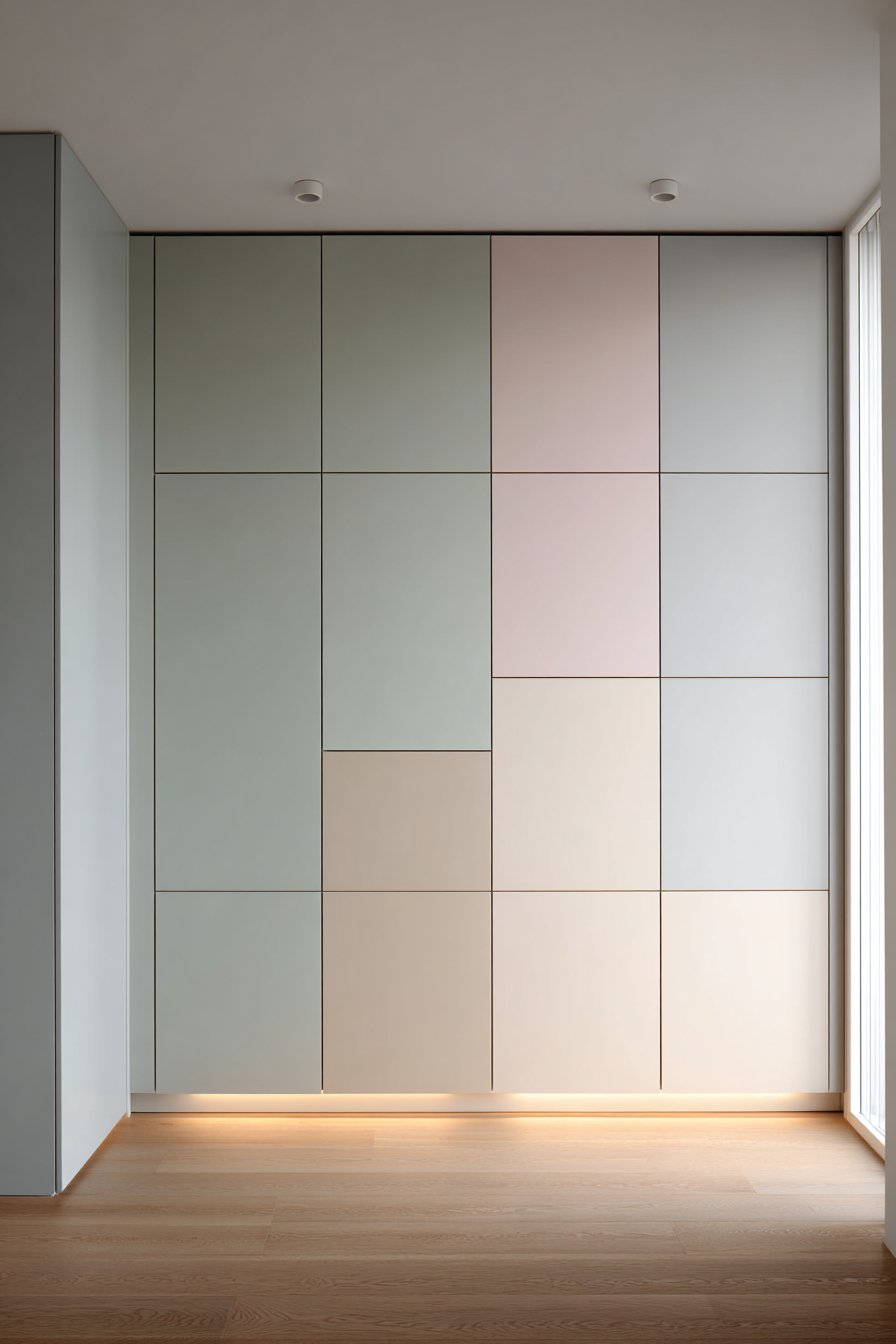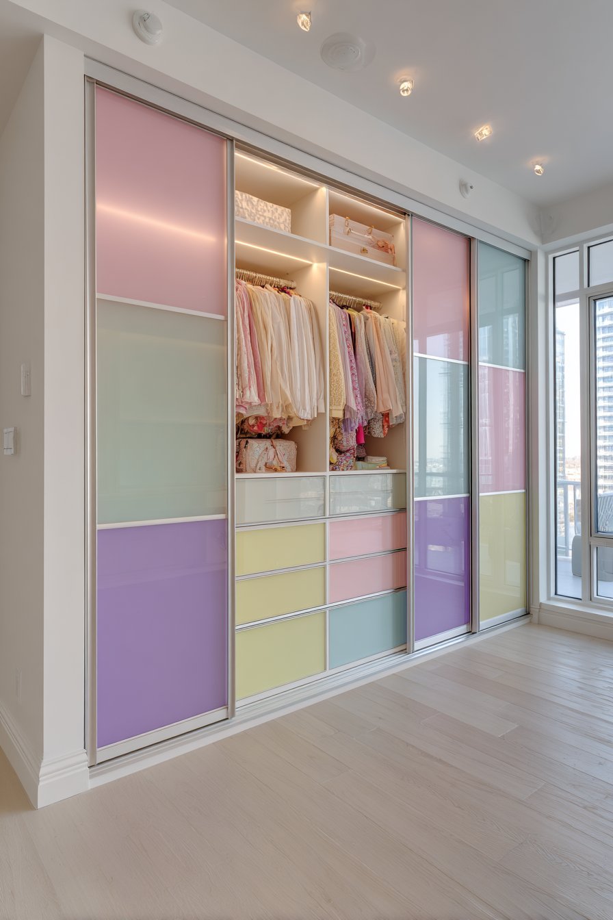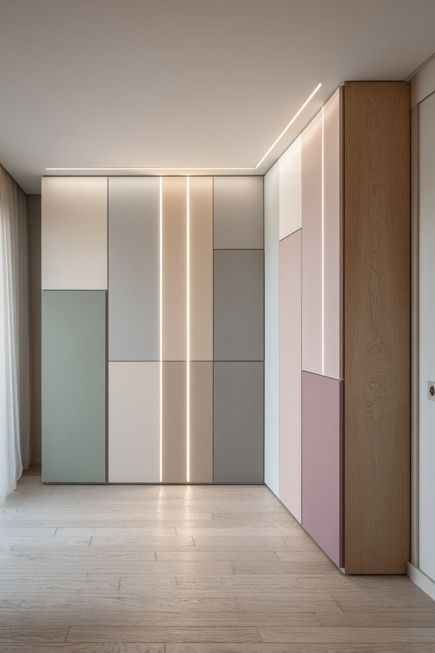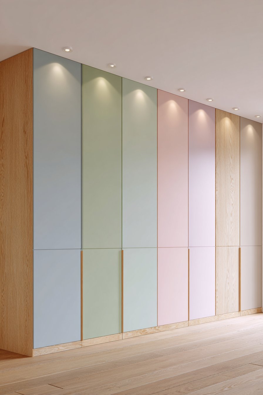 Innovative storage solutions combine functionality with artistic color expression. Built-in cabinets feature handleless doors in alternating pastel tones. Mint green, blush pink, and soft lavender create a playful yet sophisticated effect. The matte finish maintains contemporary appeal while showcasing the color blocking.