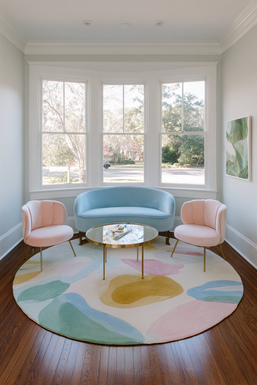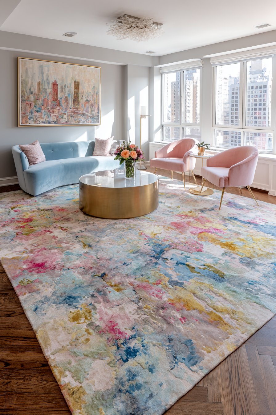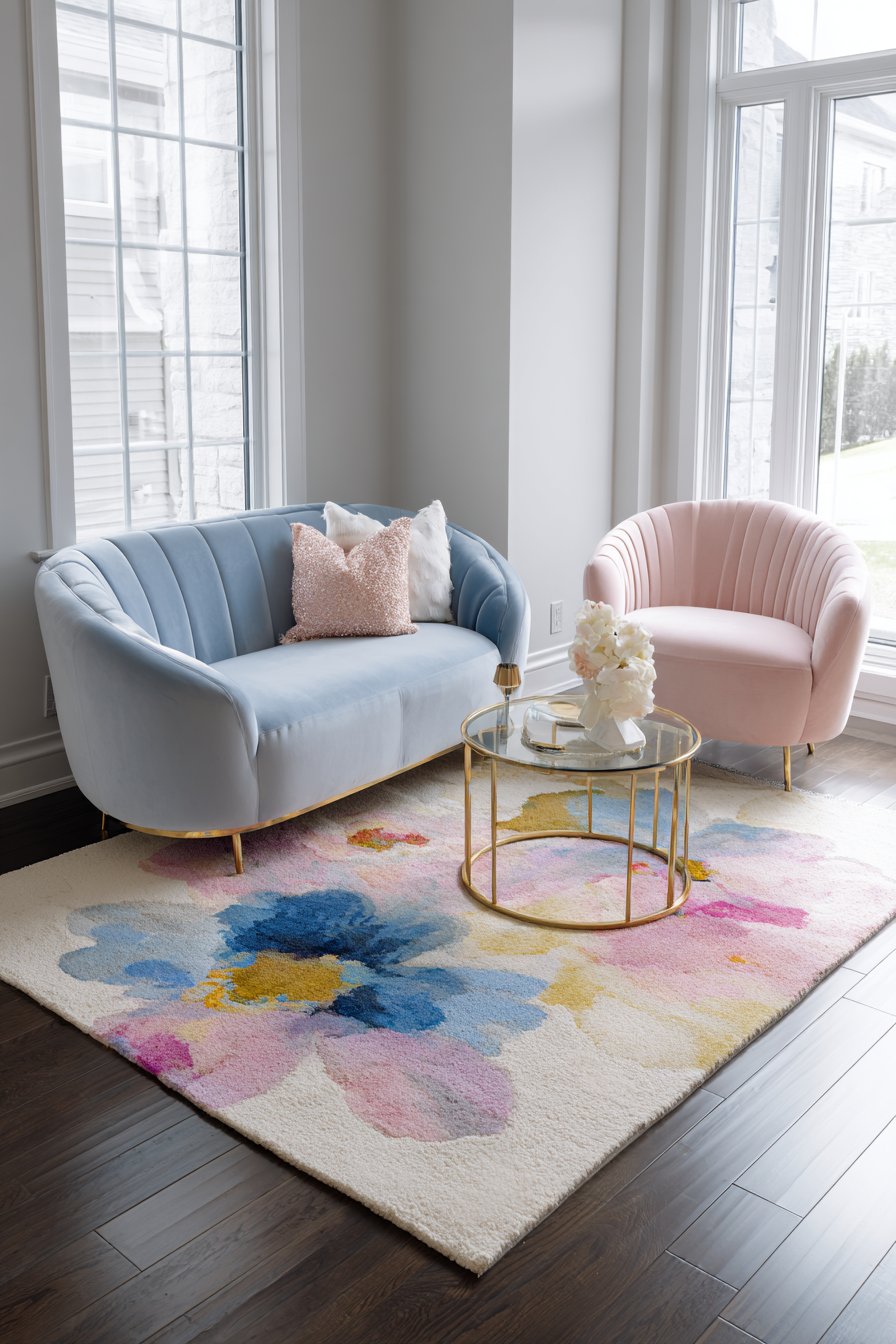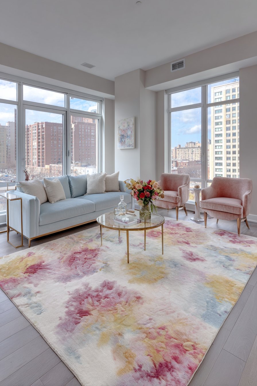 The rug anchors a seating area with contemporary loveseat in powder blue velvet. Two accent chairs in blush pink linen complete the furniture grouping. A round brass and glass coffee table centers the arrangement delicately. Pale gray walls and large windows with natural light surround the seating zone.