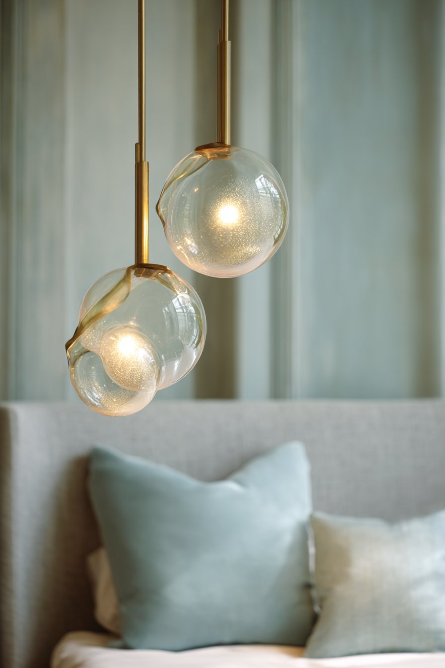 Contemporary pendant lighting serves as sculptural art and functional illumination. Hand-blown glass globes in soft coral tone hang from ceiling-mounted brass rods. The pendants suspend at asymmetric heights for dynamic visual interest. They flank an upholstered headboard in pale gray-blue linen elegantly.