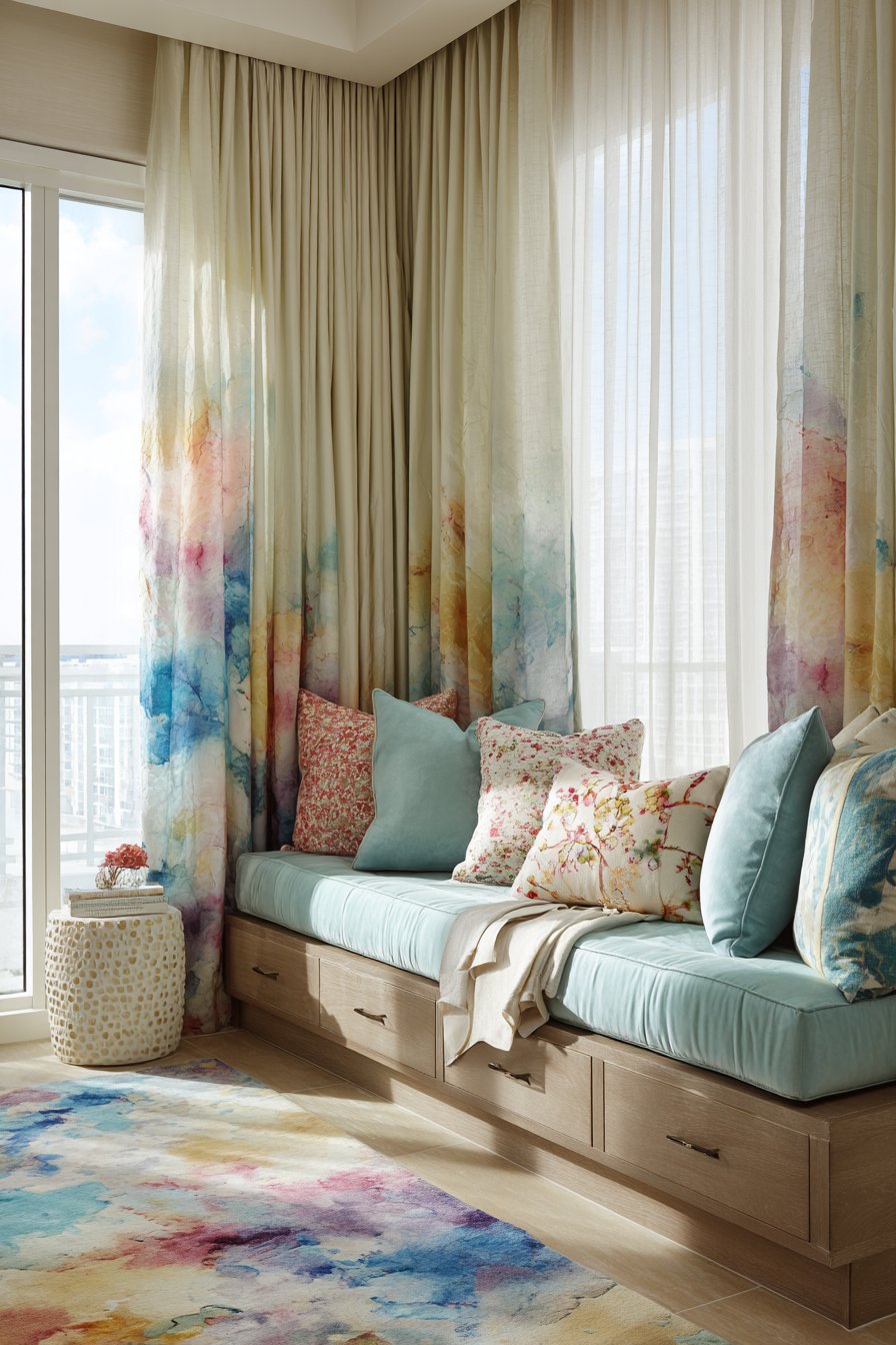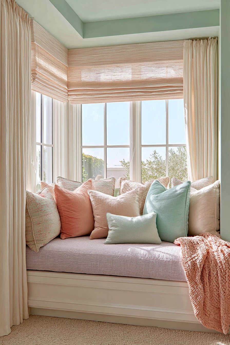 A built-in window seat transforms architectural features into functional comfort zones. The cushioned bench features performance fabric upholstery in soft lilac tone. Multiple throw pillows in varied pastel shades create inviting texture. Velvet, linen, and cotton fabrics provide tactile variety and visual richness.