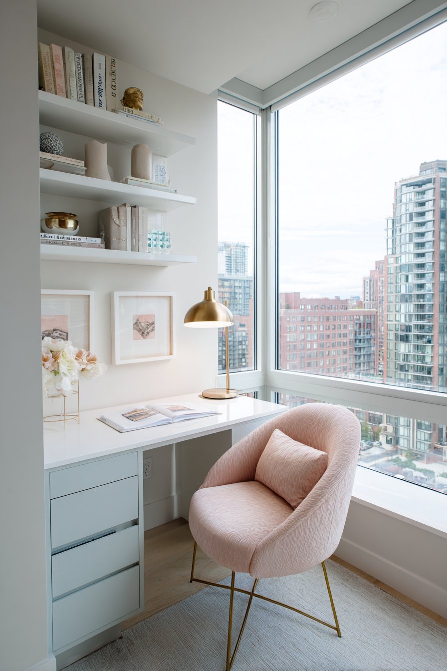 A dedicated workspace corner seamlessly integrates into the bedroom environment. The sleek white lacquered desk features powder blue drawer fronts that introduce gentle color. Gold hairpin legs provide modern industrial contrast. An ergonomic blush pink upholstered task chair combines comfort with aesthetic appeal.