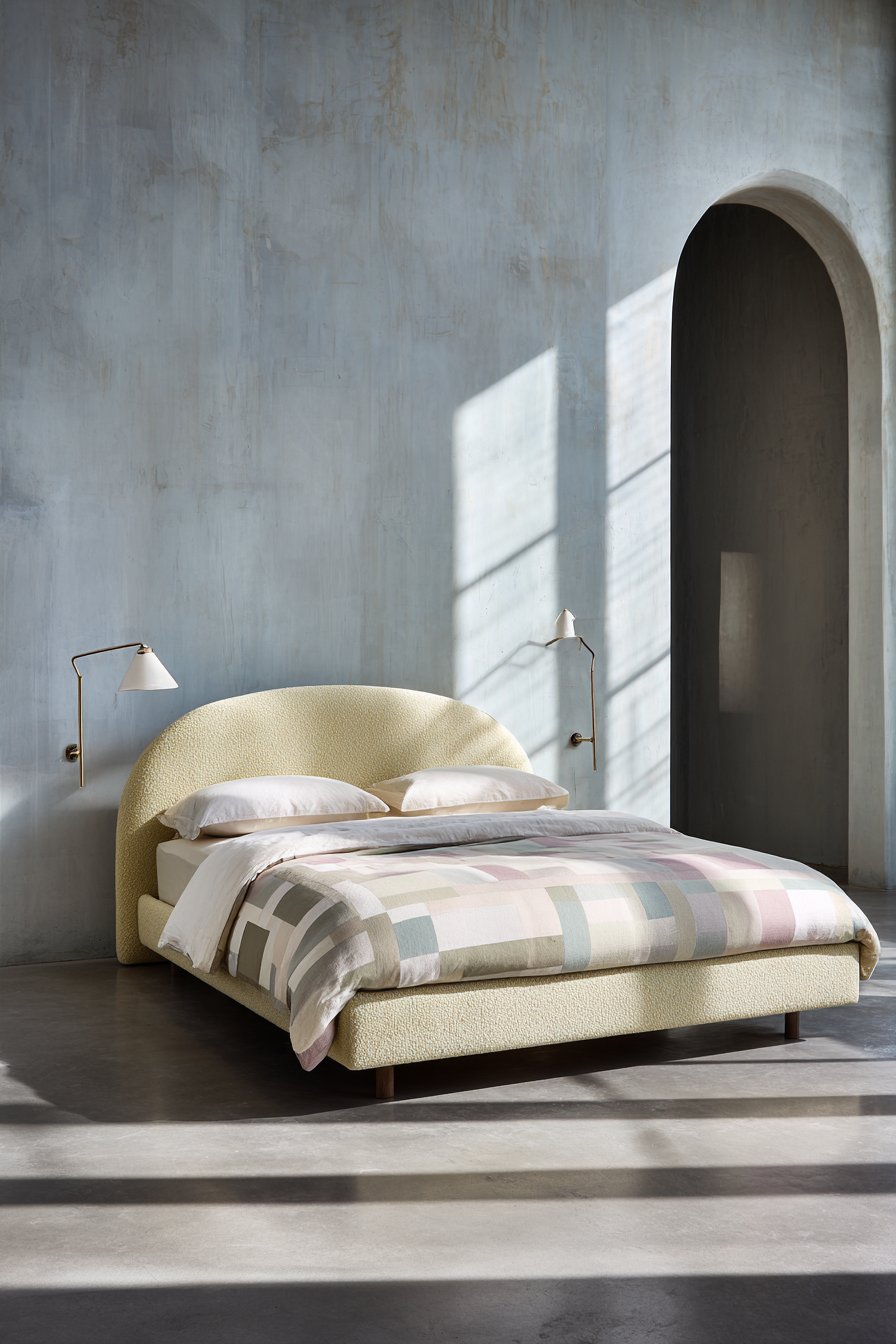 An oversized curved headboard creates stunning sculptural focal point. Bouclé fabric in soft butter yellow provides tactile interest and warm color. The curved form adds architectural softness to rectangular room geometry. The scale demands attention while maintaining bedroom serenity through gentle color choice.