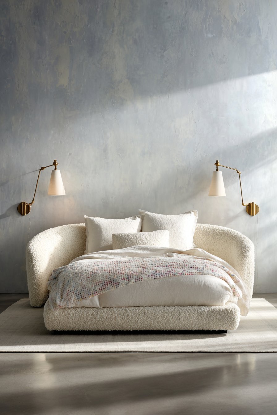 Walls painted in the palest shade of gray-blue provide subtle backdrop. The smooth matte finish allows the textured headboard to shine. Natural lighting emphasizes the bouclé fabric’s tactile quality beautifully. Soft shadows define the headboard’s sculptural form throughout the day.