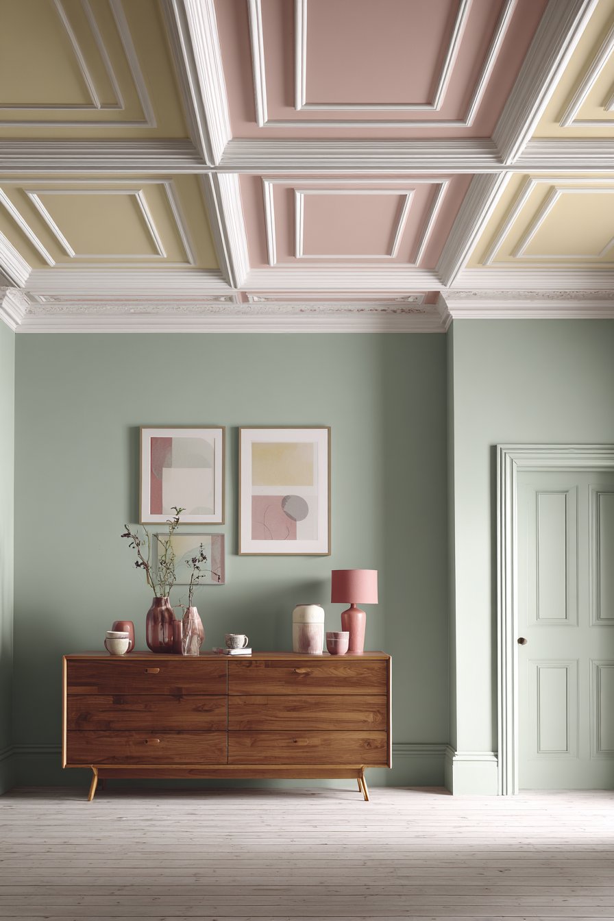 The architectural detail of the ceiling treatment adds visual interest without overwhelming. White geometric molding provides crisp contrast against the peach background. This combination demonstrates how pastels work beautifully in modern architectural applications. The effect feels fresh rather than traditional or dated.