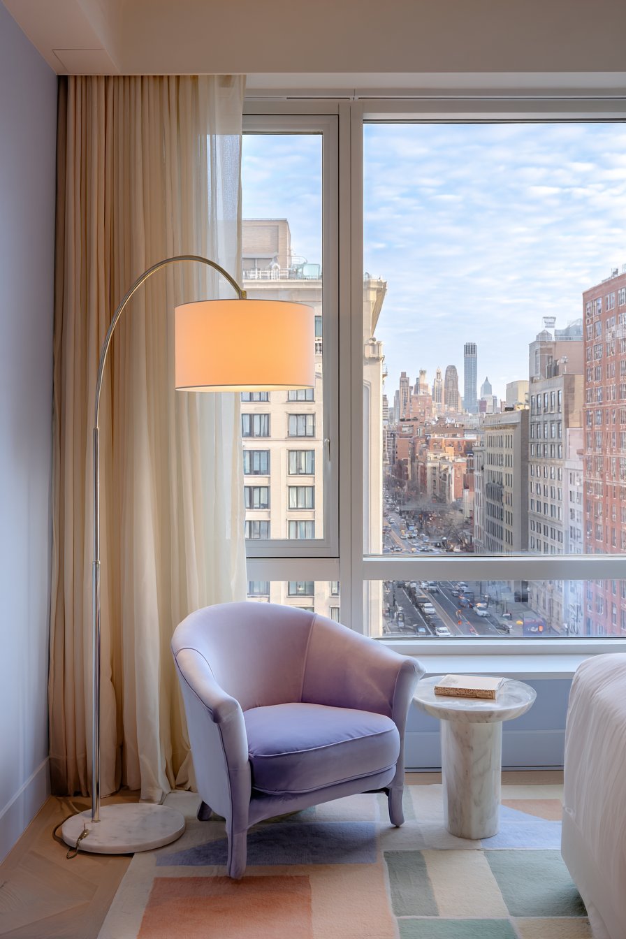 - Layer lighting with both floor lamps and natural sources