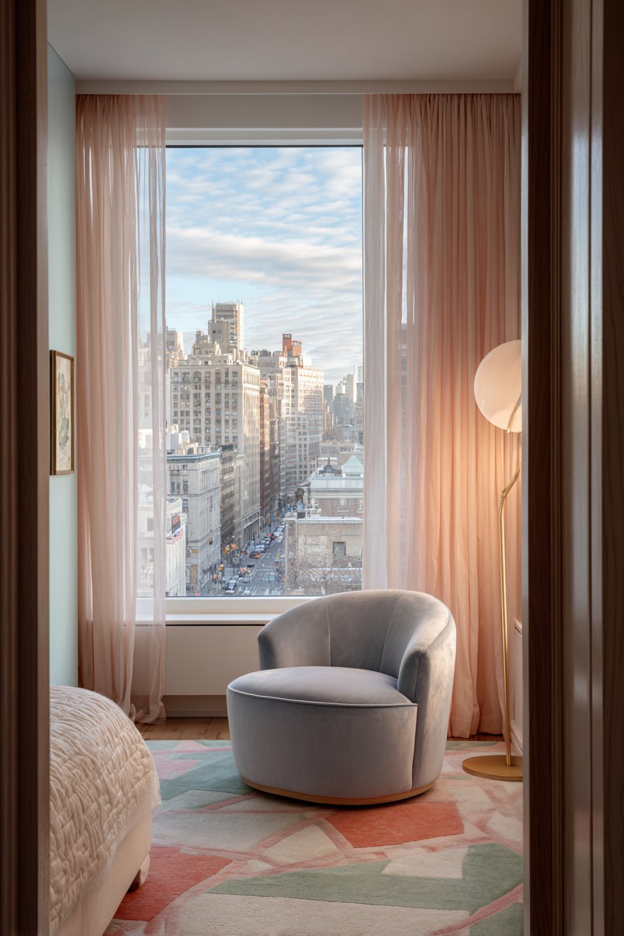 Natural light creates a luminous atmosphere throughout the day. Professional attention to lighting layering ensures the space functions well at all hours. The velvet chair fabric adds tactile luxury that enhances comfort. Thoughtful textile selection contributes to the room’s overall sensory experience.
