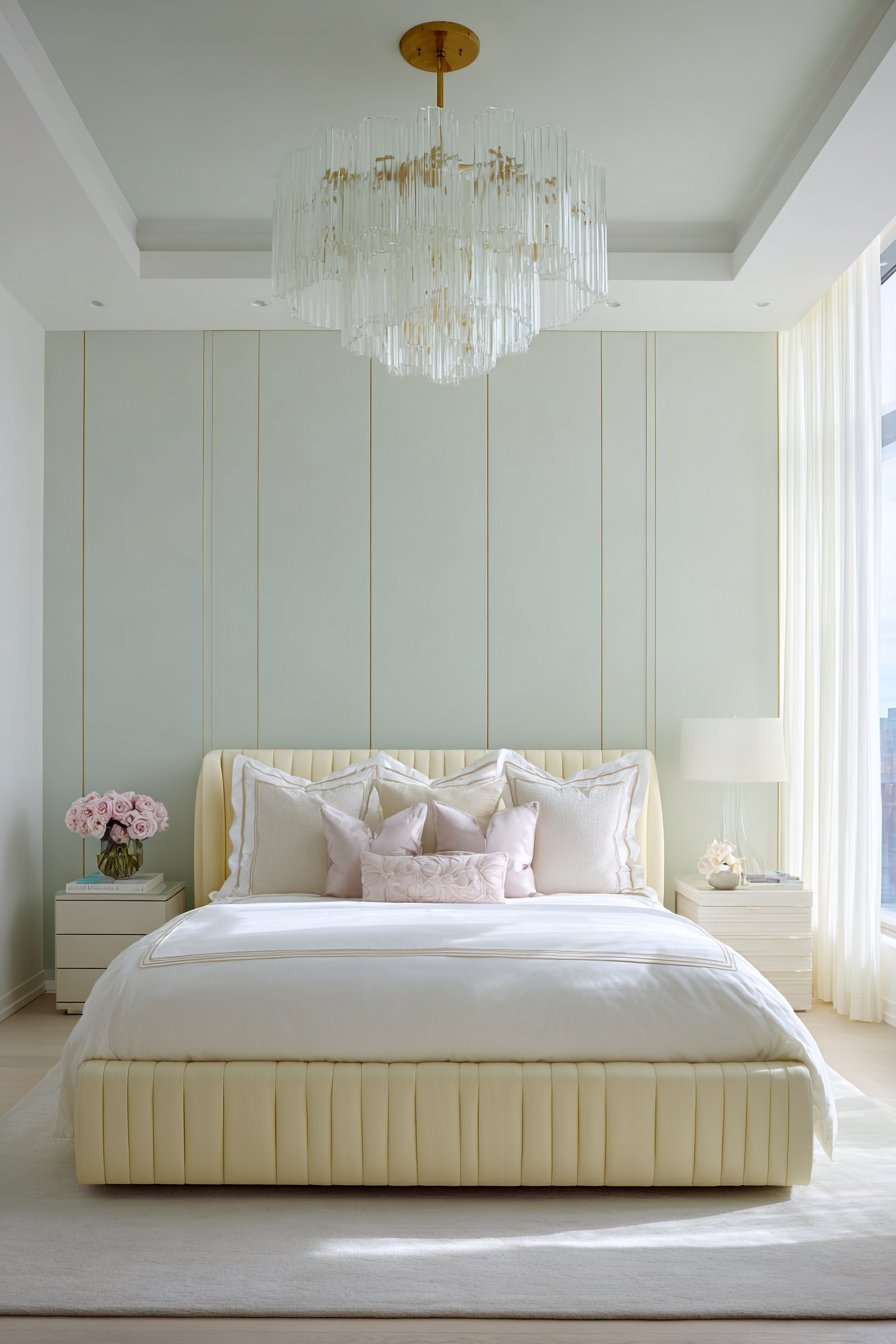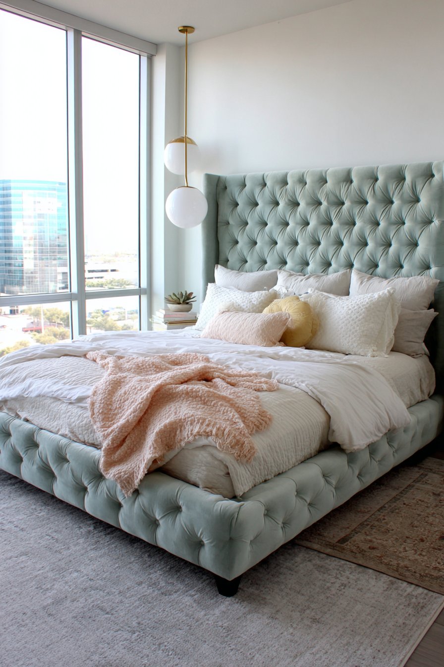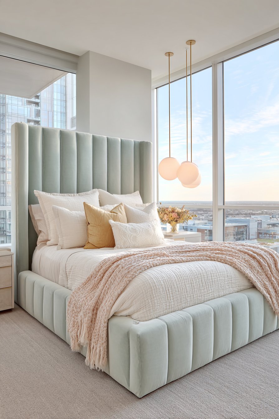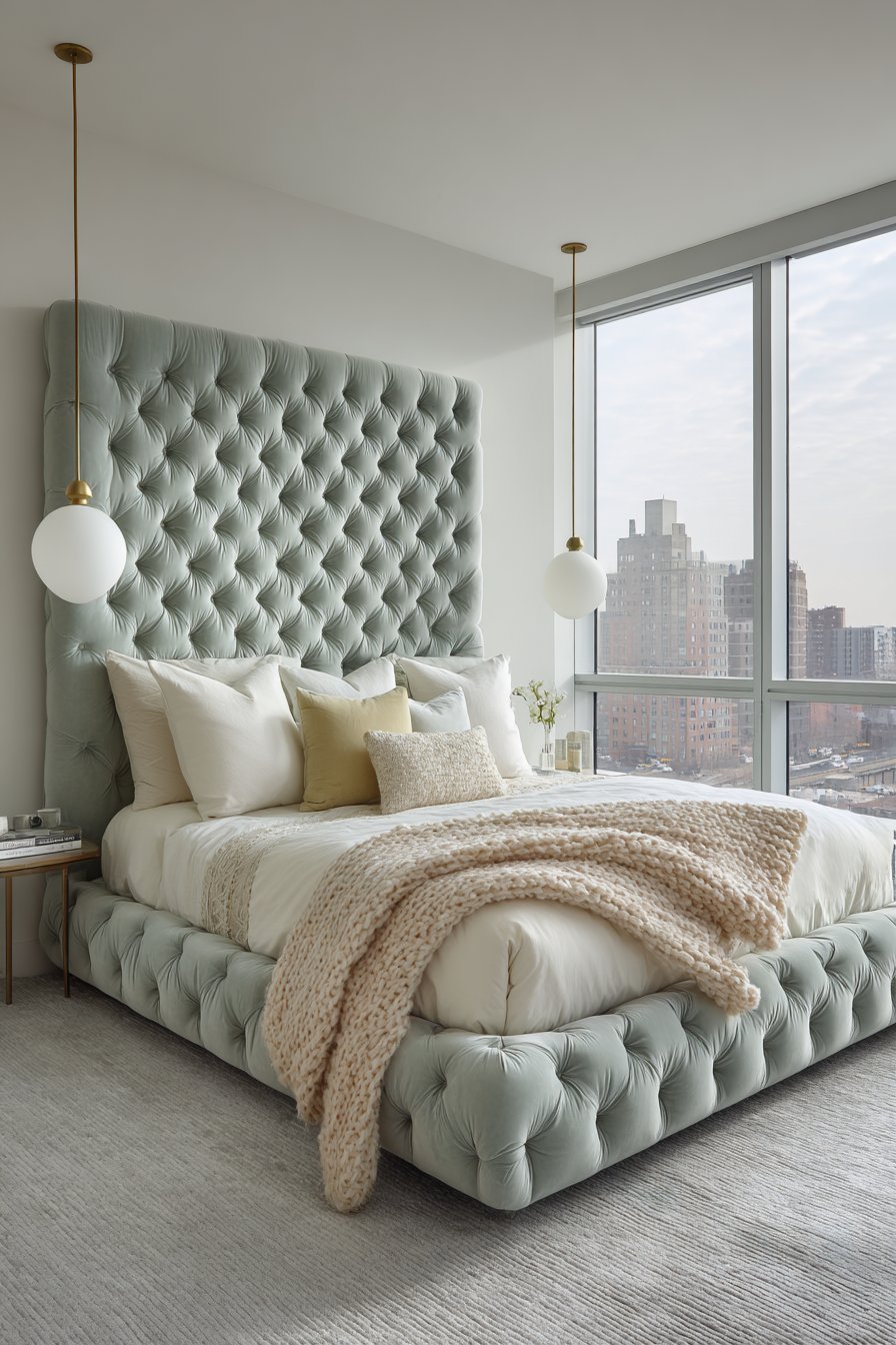 A dramatic tufted headboard extends from floor to ceiling as the ultimate focal point. Seafoam green velvet creates luxurious texture and bold color presence. The scale of this feature demands attention while maintaining bedroom serenity. Layered bedding in whites and creams provides neutral contrast.