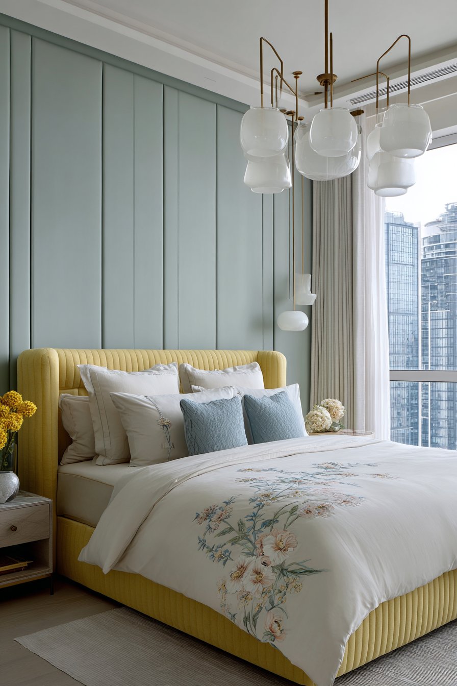Soft butter yellow upholstery creates unexpected warmth in this sophisticated bedroom. The channel-tufted bed frame features vertical lines that add visual interest. Crisp white bedding with delicate embroidered details provides refined contrast. The embroidery incorporates pale blue and pink for subtle color coordination.