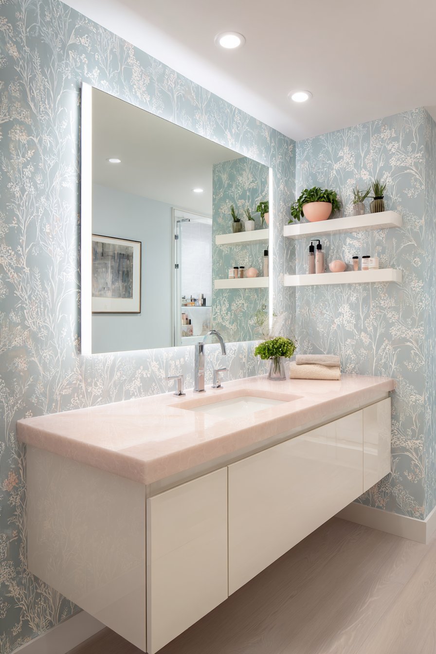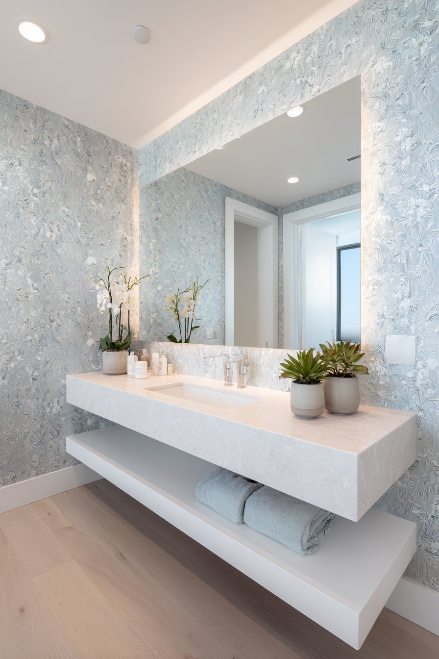 Textured wallpaper in soft gray-blue covers the surrounding walls with delicate botanical patterns. The pattern adds visual interest without overwhelming the clean vanity design. The wallpaper choice demonstrates how to incorporate pattern subtly in modern spaces. Scale and color selection prevent the pattern from competing with other elements.