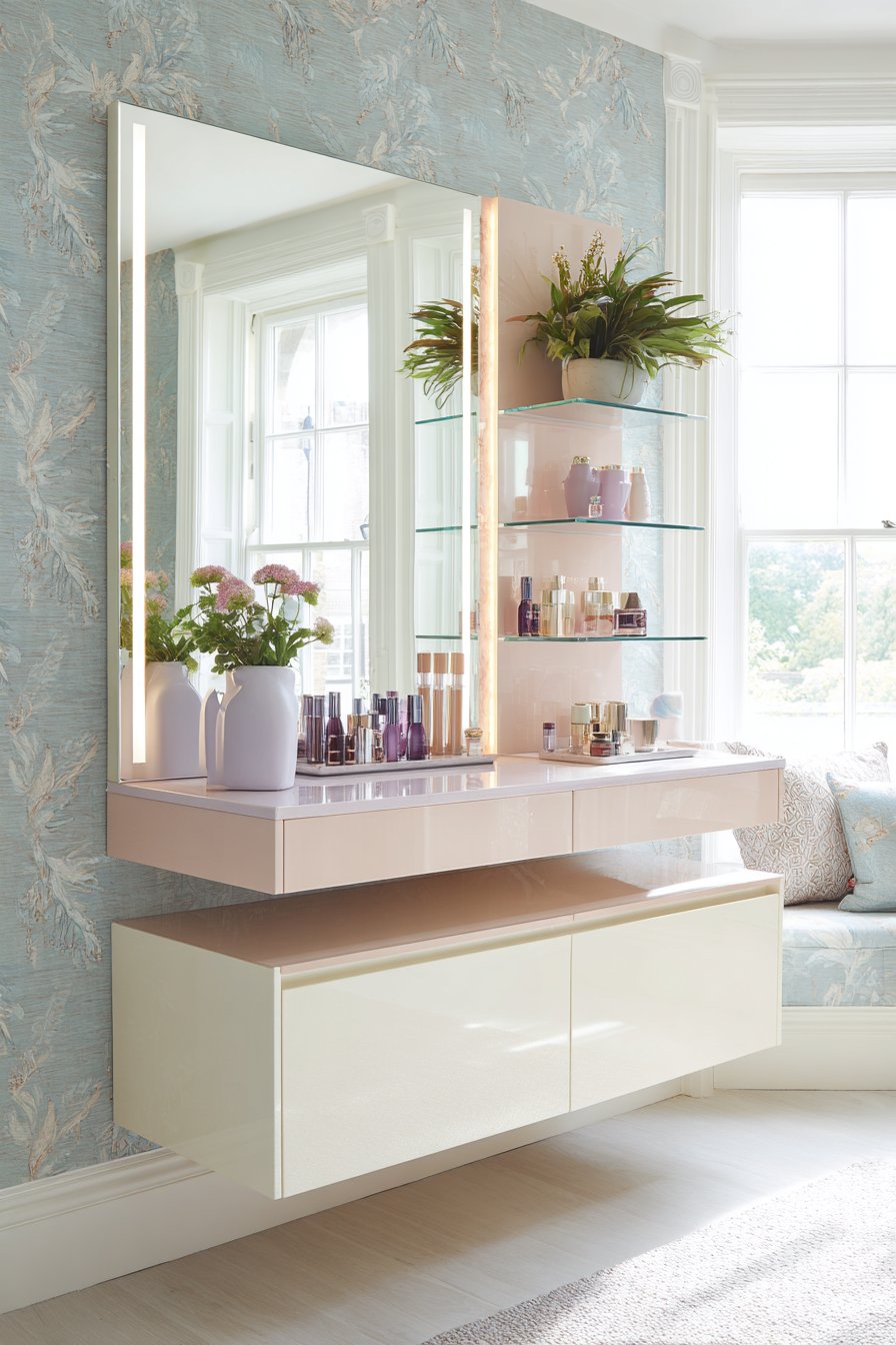 Open shelving to the side displays beauty products and plants in coordinated containers. Ceramic pots in lavender, peach, and mint glazes continue the pastel theme. Small integrated LED lighting illuminates the mirror perimeter for practical grooming tasks. The lighting creates professional-quality illumination without harsh shadows.