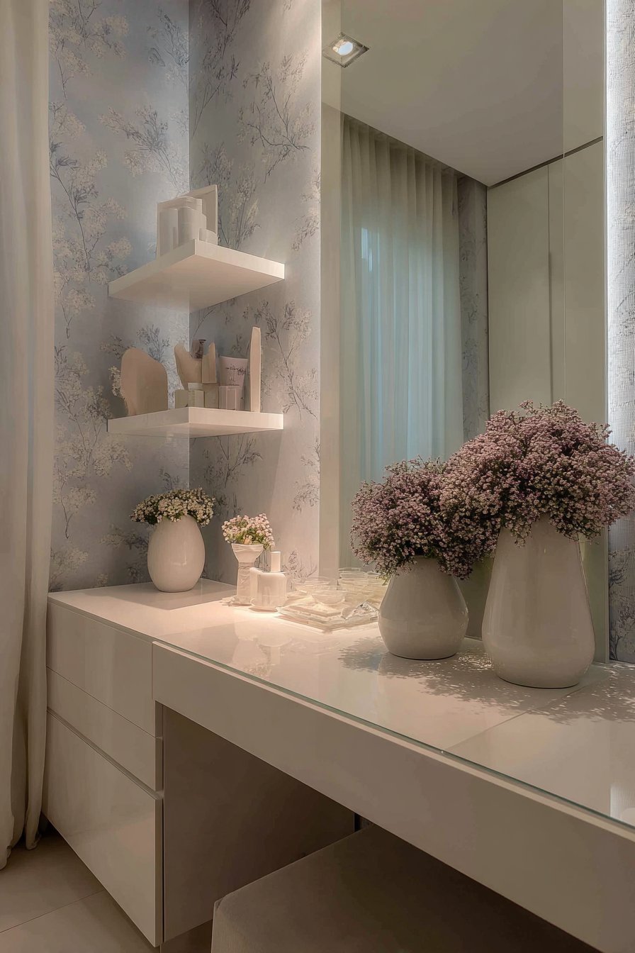 A sleek floating vanity creates a functional beauty station within the bedroom. High-gloss white lacquer reflects light and maintains contemporary aesthetics. The pale pink quartz countertop provides subtle color accent and luxurious material quality. A large frameless mirror above expands visual space effectively.
