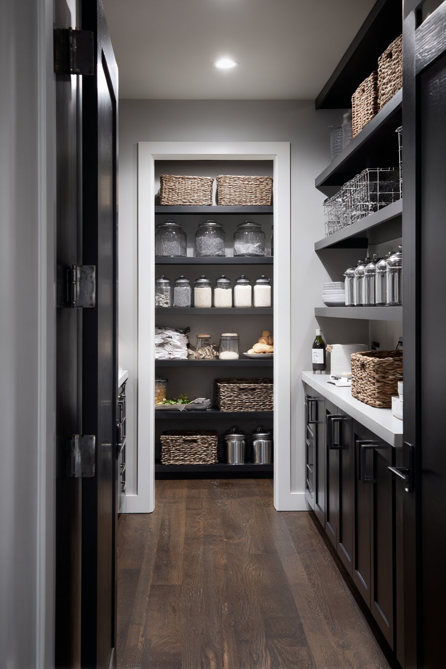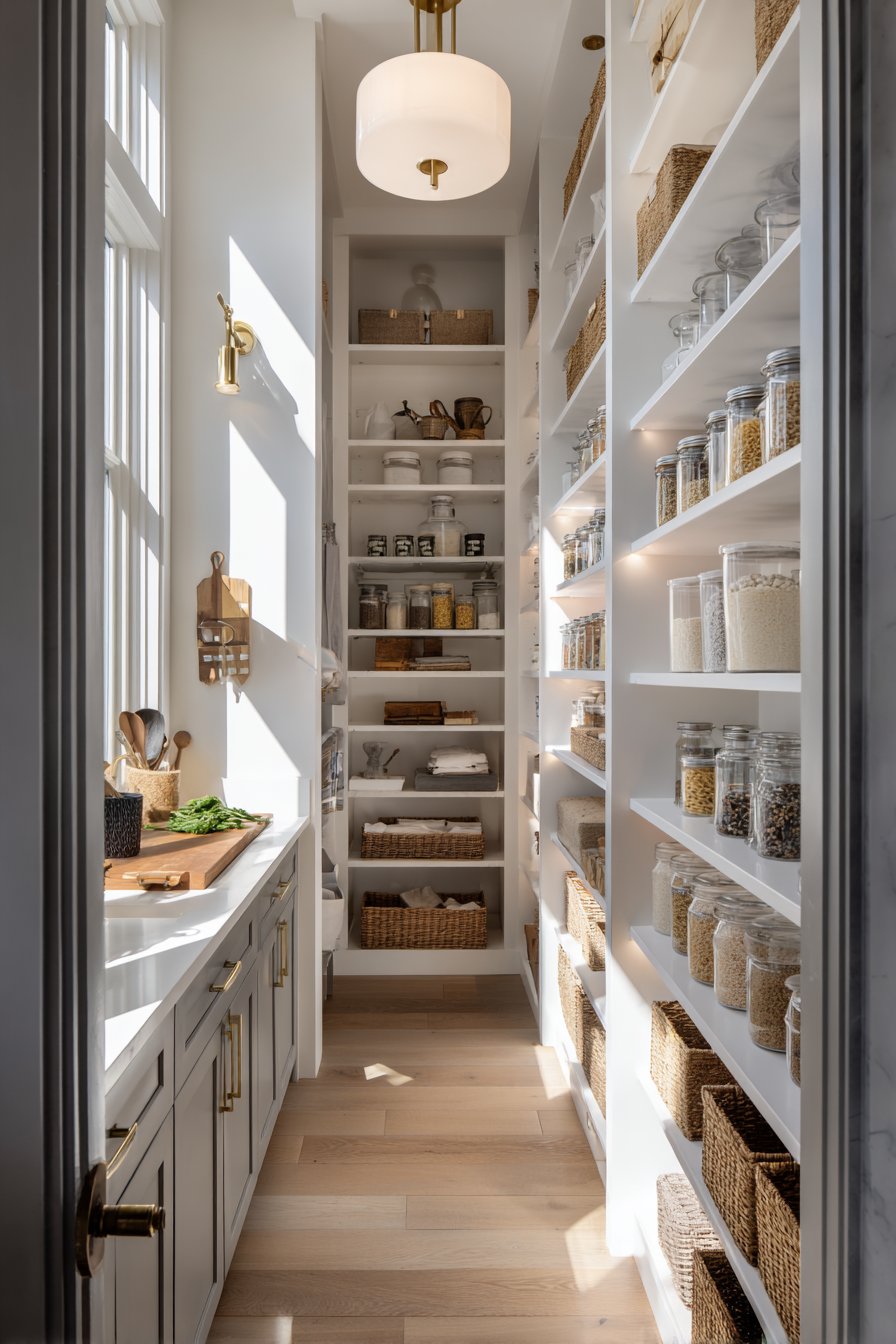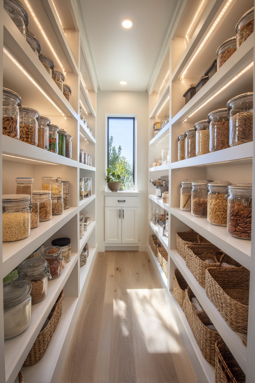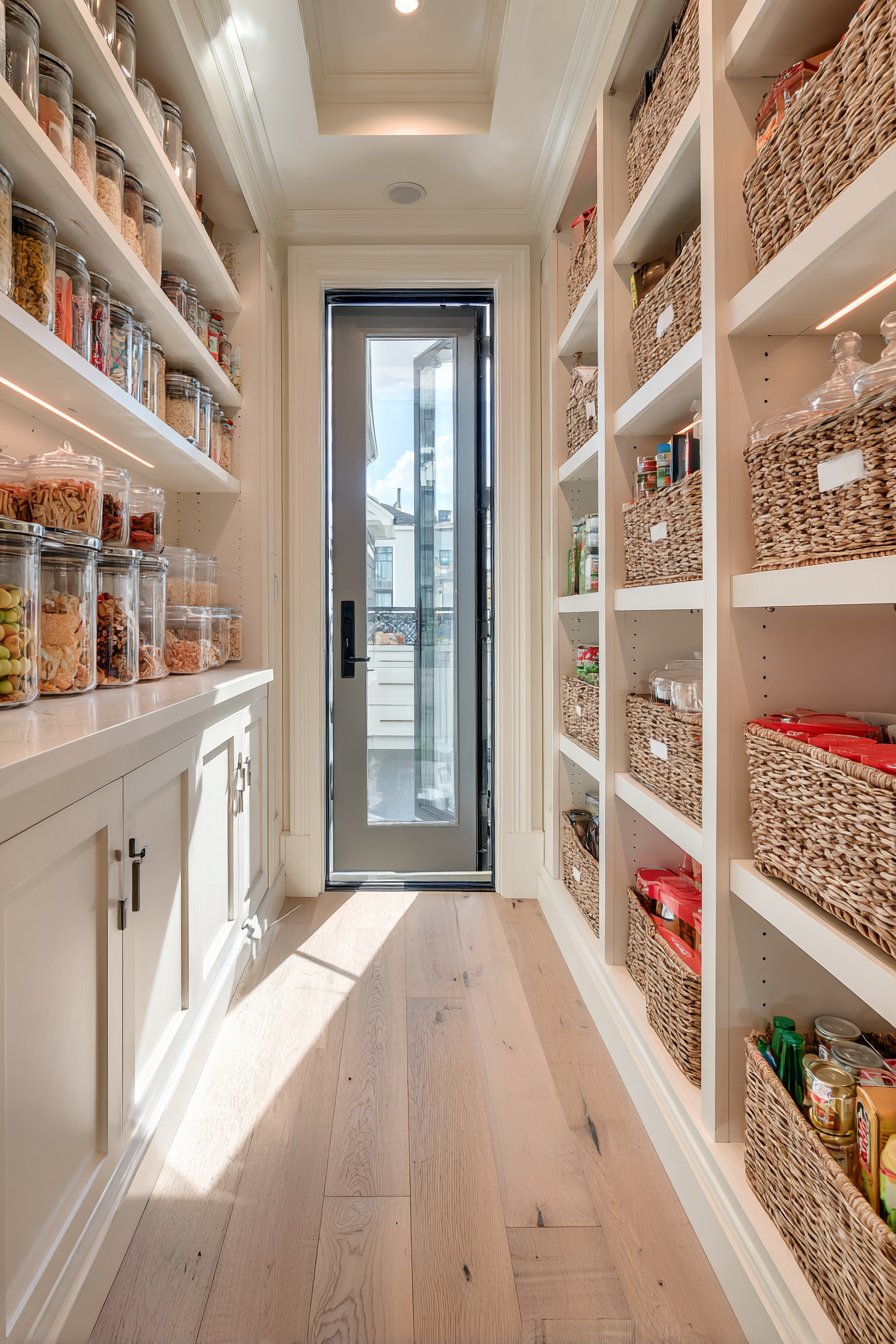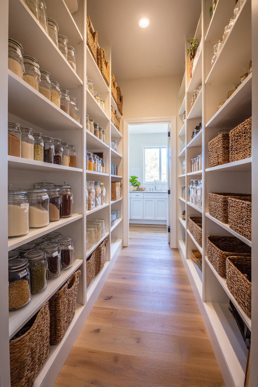 Floor-to-ceiling white custom shelving creates an organized corridor along both walls. The shelving units measure twelve inches deep with adjustable heights. This configuration accommodates varying container sizes beautifully. Clear glass storage containers display dry goods with visual clarity. Neatly labeled wicker baskets organize smaller items efficiently.