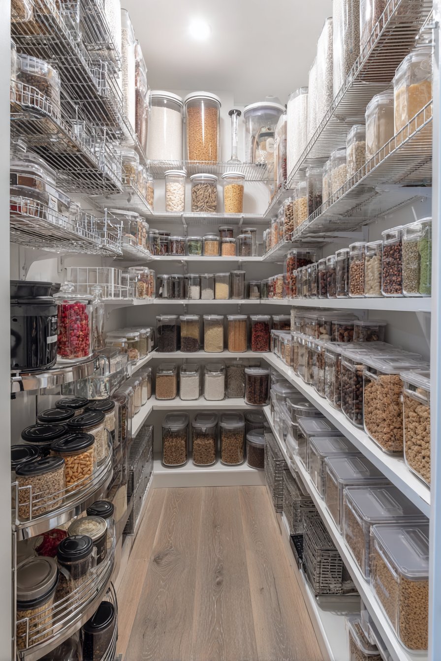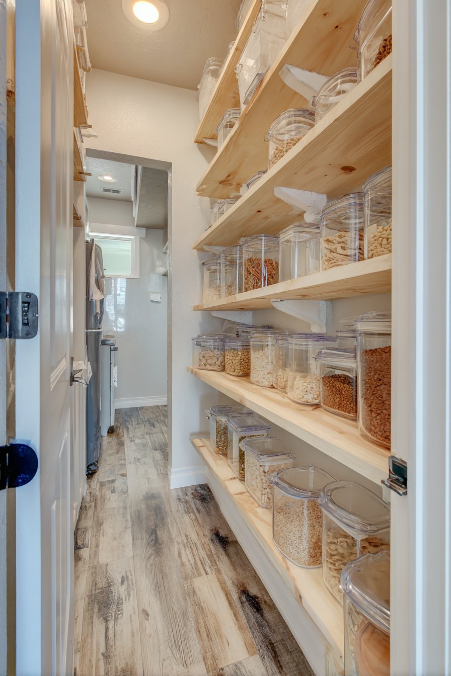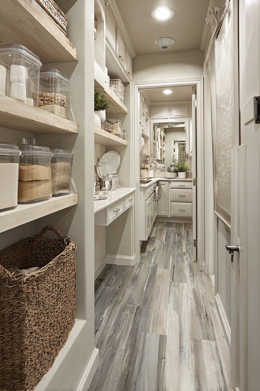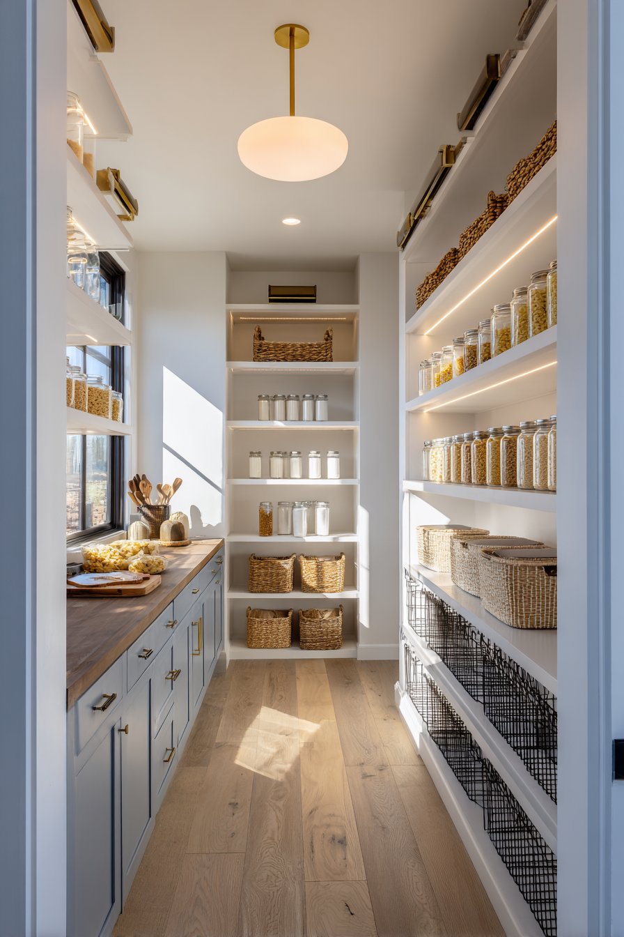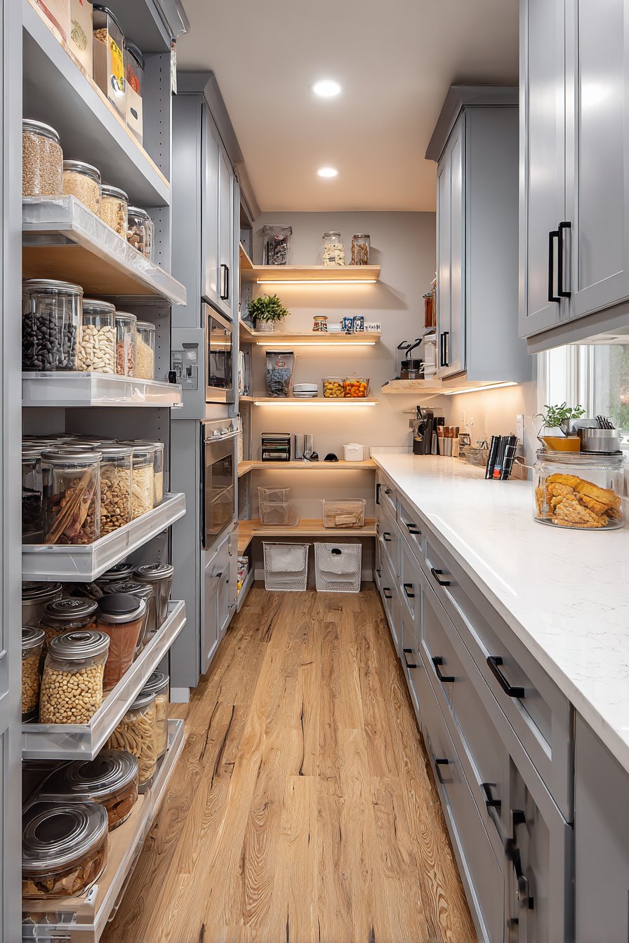 Floor-to-ceiling white custom shelving creates an organized corridor along both walls. The shelving units measure twelve inches deep with adjustable heights. This configuration accommodates varying container sizes beautifully. Clear glass storage containers display dry goods with visual clarity. Neatly labeled wicker baskets organize smaller items efficiently.
