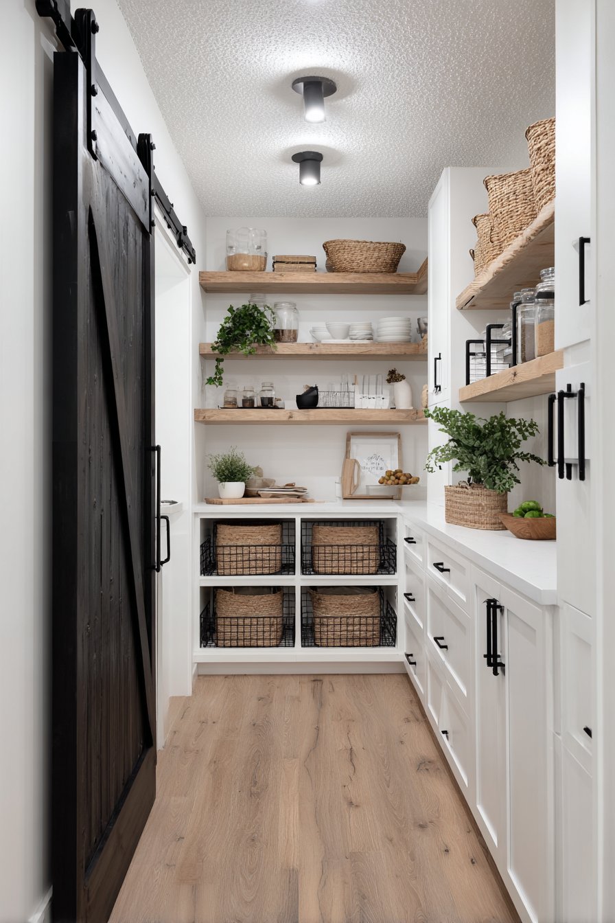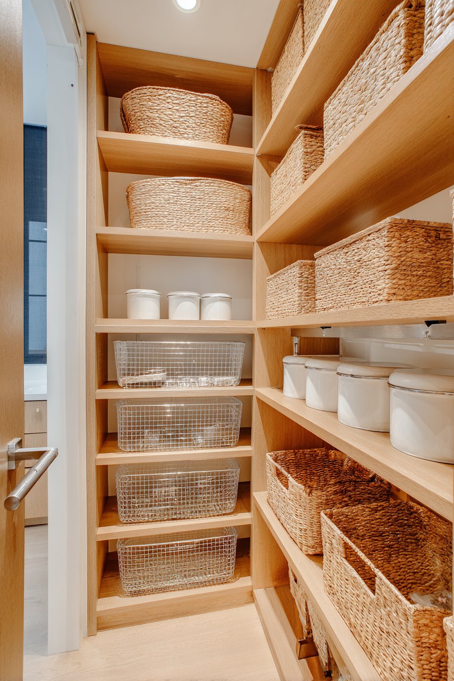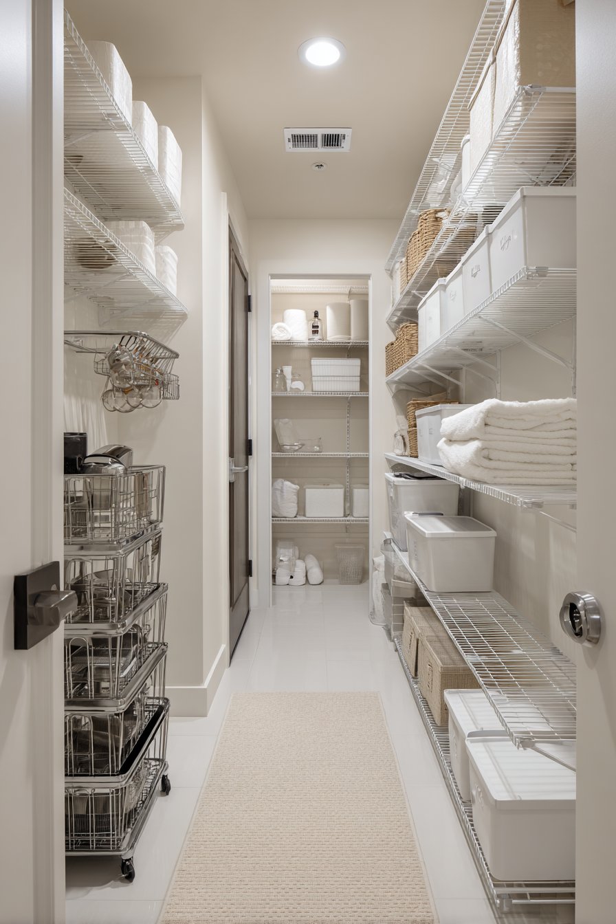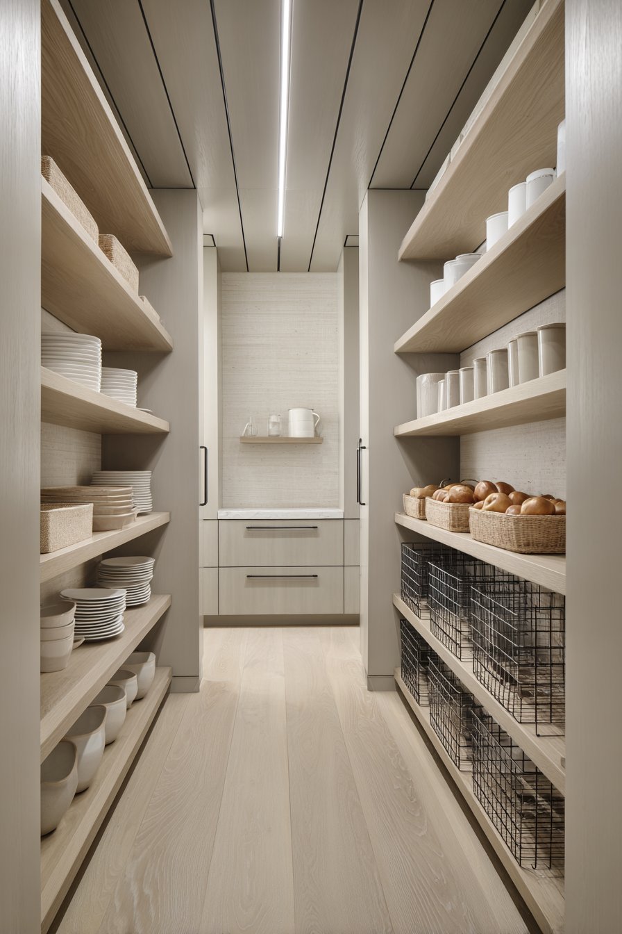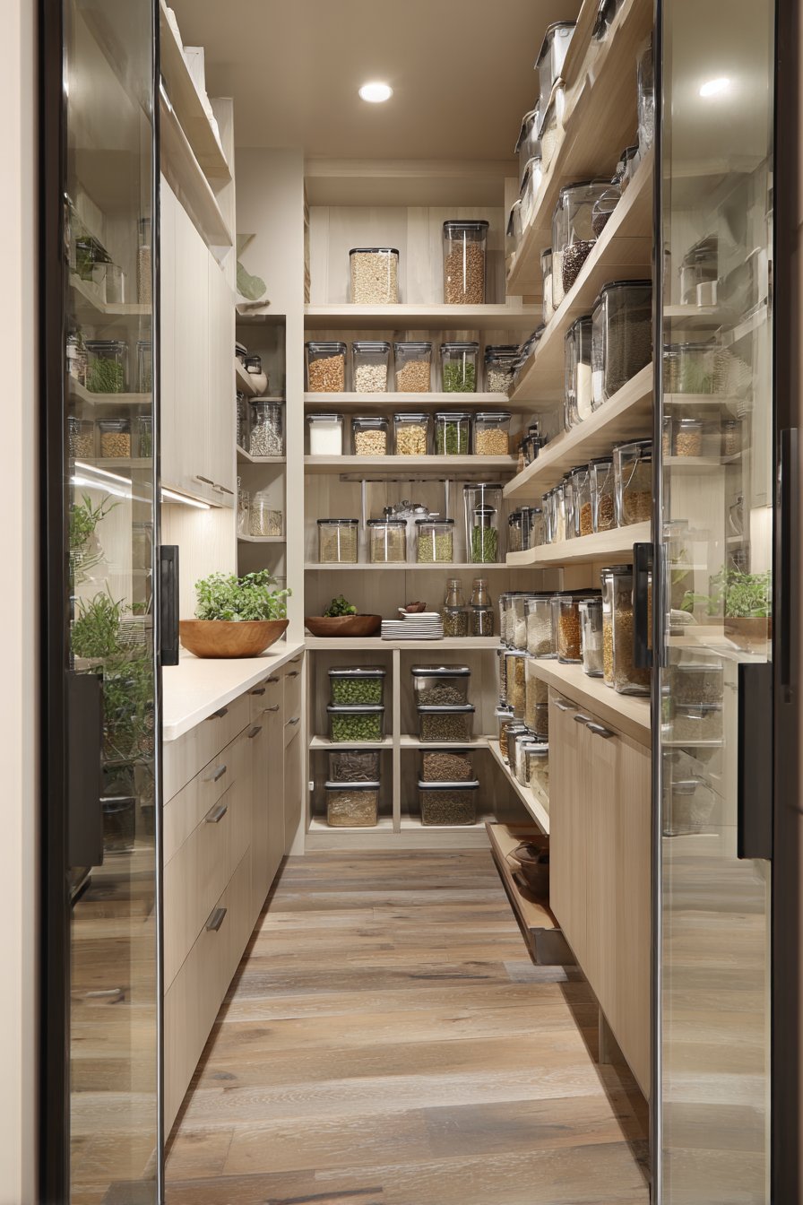 Floor-to-ceiling white custom shelving creates an organized corridor along both walls. The shelving units measure twelve inches deep with adjustable heights. This configuration accommodates varying container sizes beautifully. Clear glass storage containers display dry goods with visual clarity. Neatly labeled wicker baskets organize smaller items efficiently.