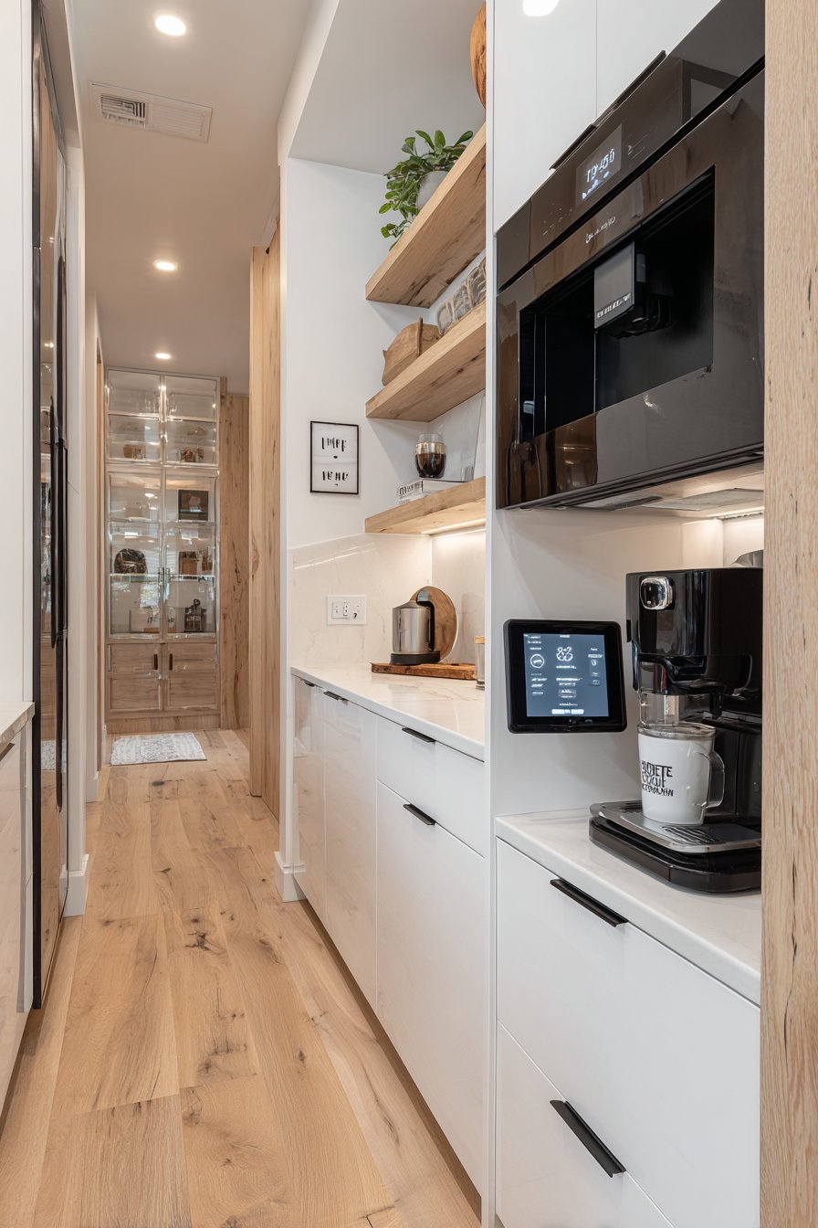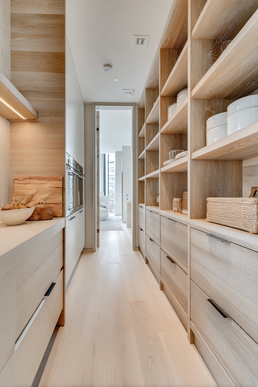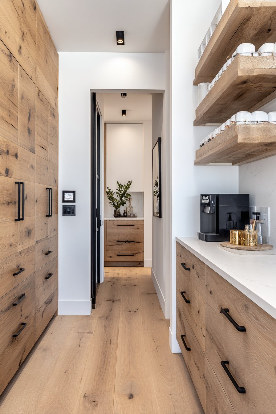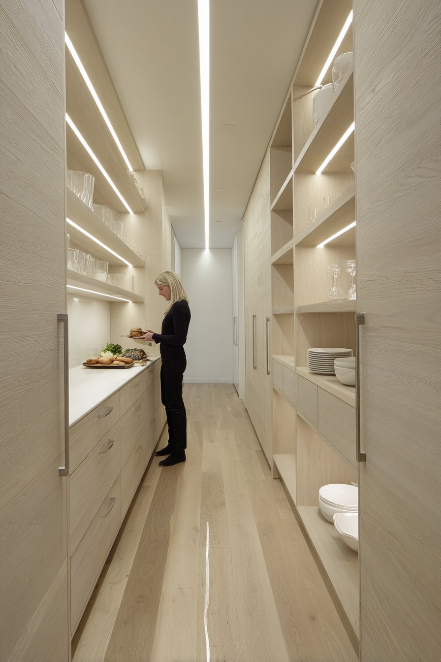 Warm LED strip lighting installs under each shelf. This illuminates contents without harsh overhead glare. Light oak flooring runs the length of the narrow space. The wood grain adds natural warmth to the white cabinetry. Natural light filters in from the kitchen entrance. Soft shadows create dimensional depth throughout the corridor.
