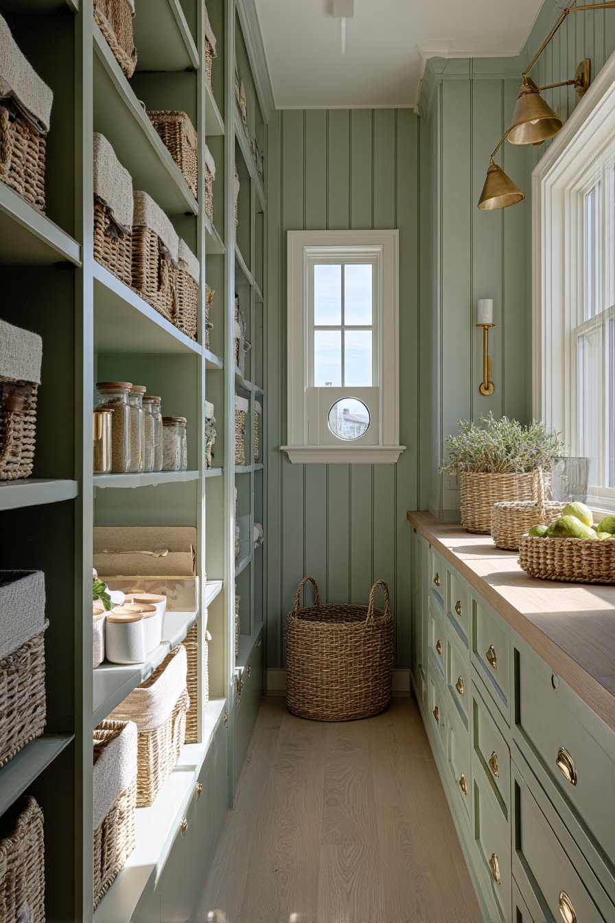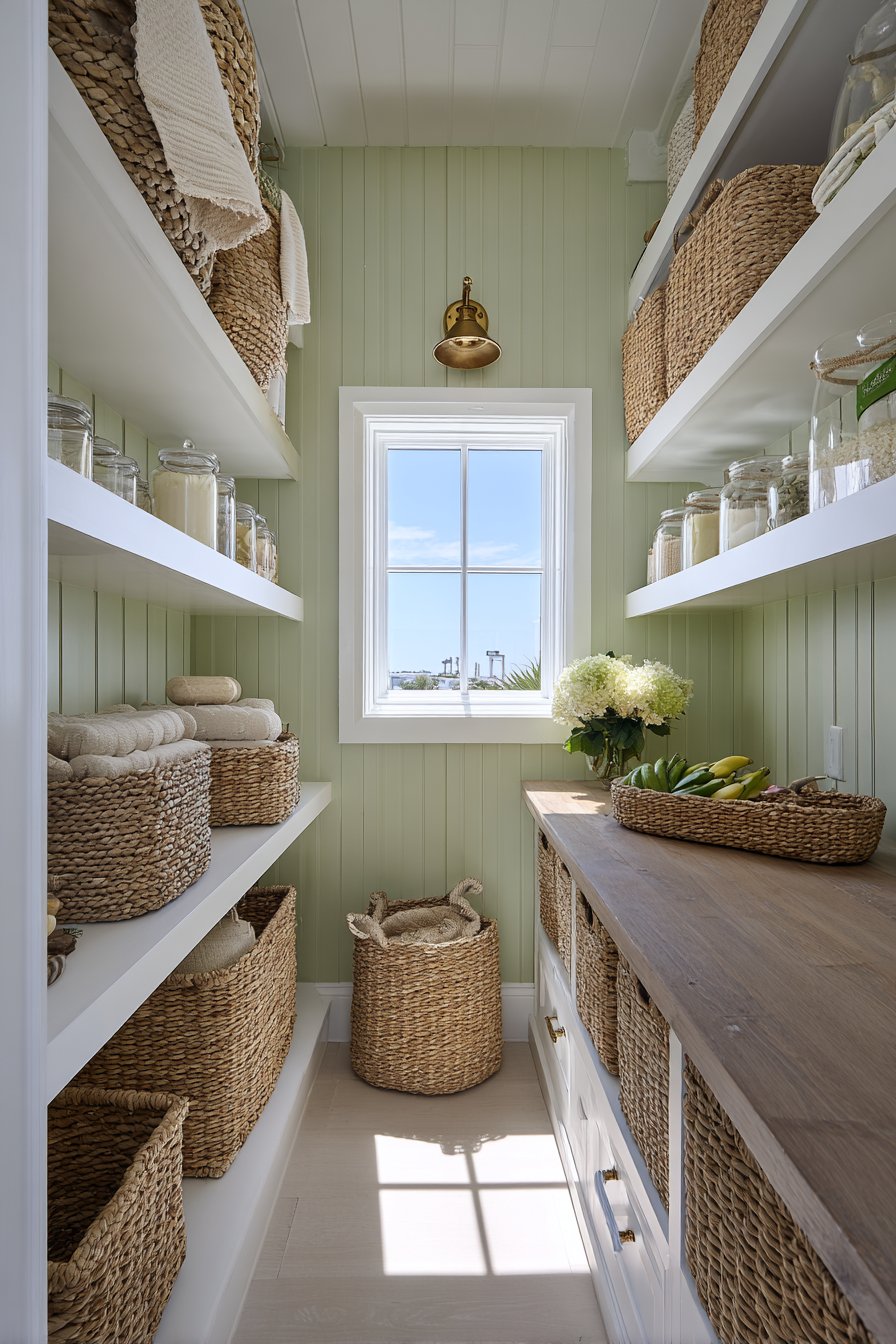 Beadboard paneling painted in soft sage green creates coastal charm. White painted wood shelving provides crisp contrast above. The thirty-four-inch space feels fresh and beach-inspired. Wicker baskets with fabric liners organize items softly. Ceramic storage jars with cork lids add natural texture.