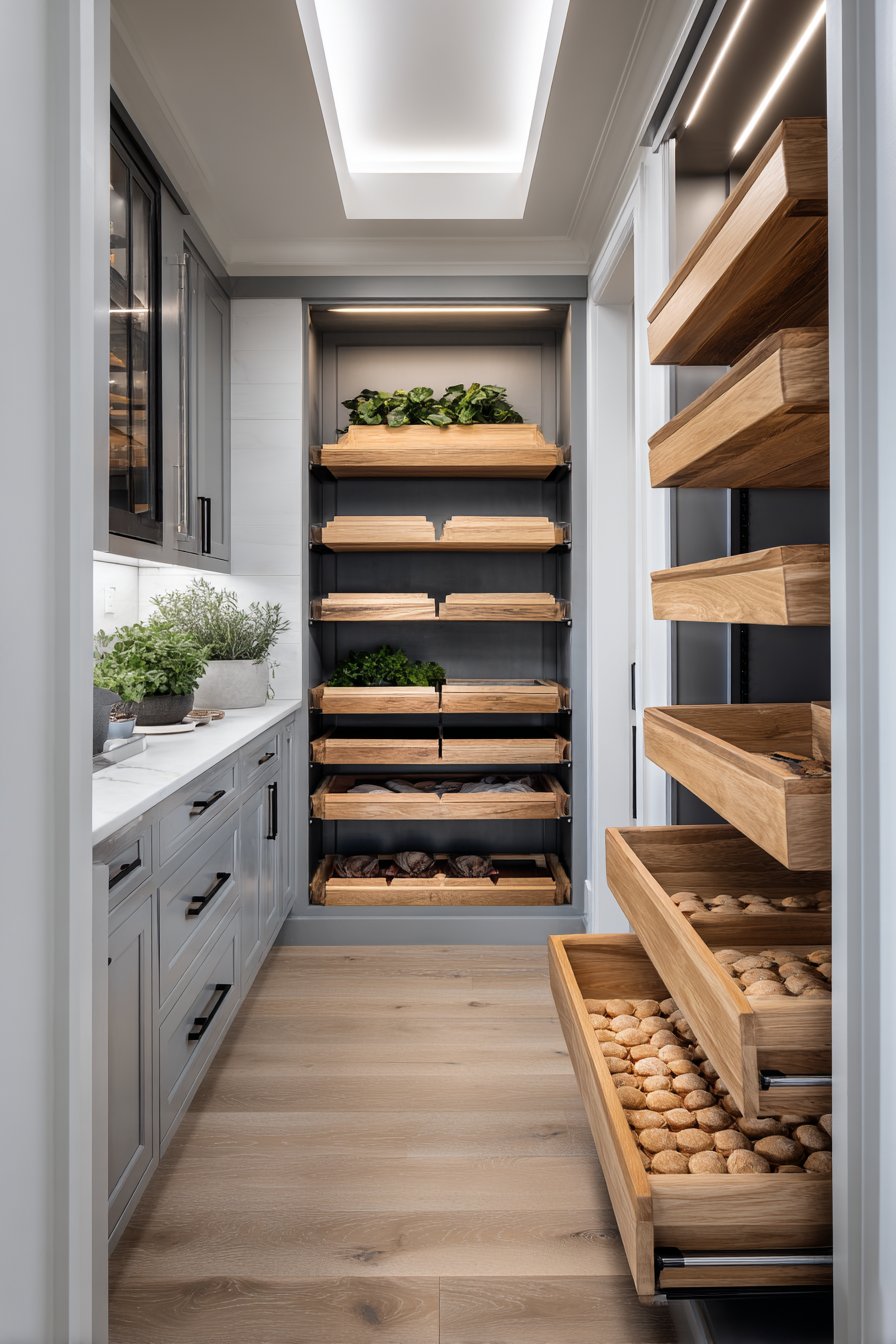 Interior design photography highlights tech-integrated features clearly. Balanced exposure showcases modern materials and innovative solutions. The pantry represents future of kitchen organization. Smart features simplify daily routines significantly. This design appeals to technology-forward homeowners seeking efficiency.