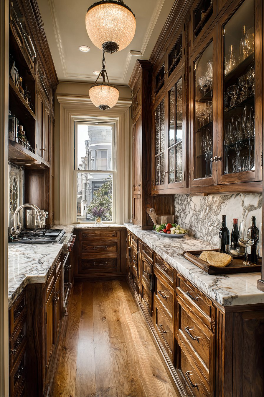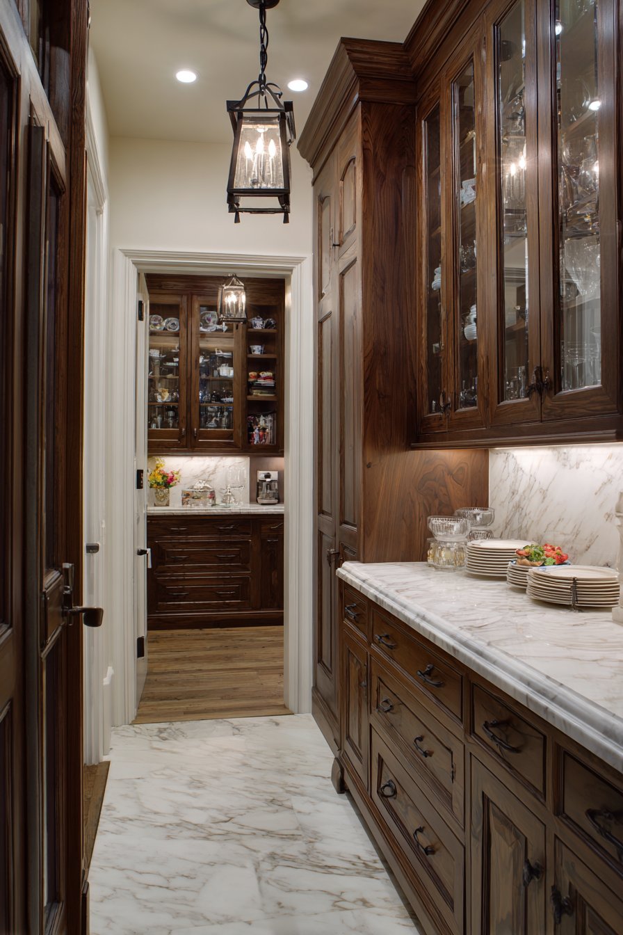 Wide-angle photography showcases refined traditional materials expertly. Natural lighting emphasizes wood grain and polished marble surface. The butler’s pantry concept brings old-world elegance forward. Formal dining preparation becomes streamlined and efficient. This design serves those who entertain with style.