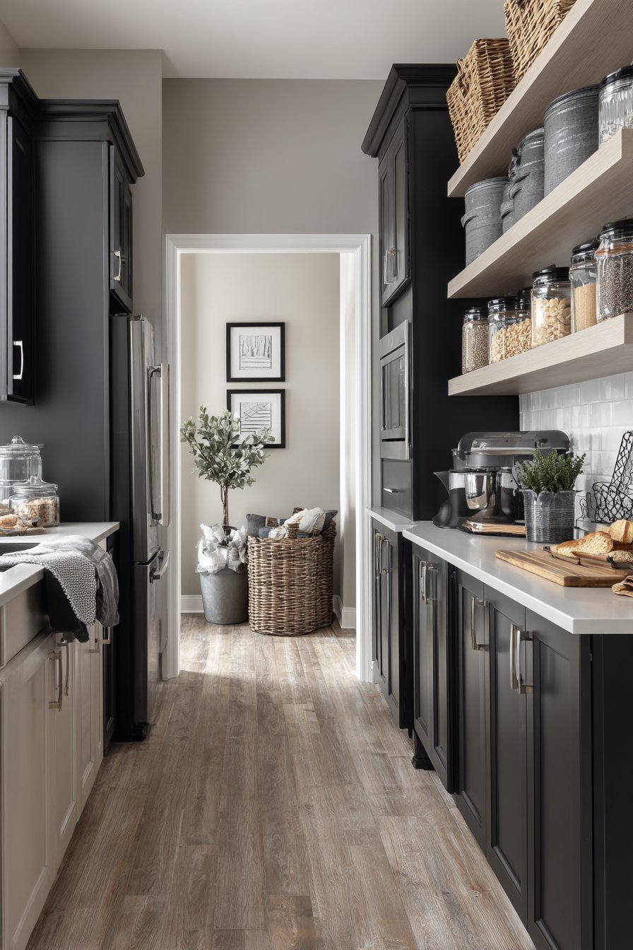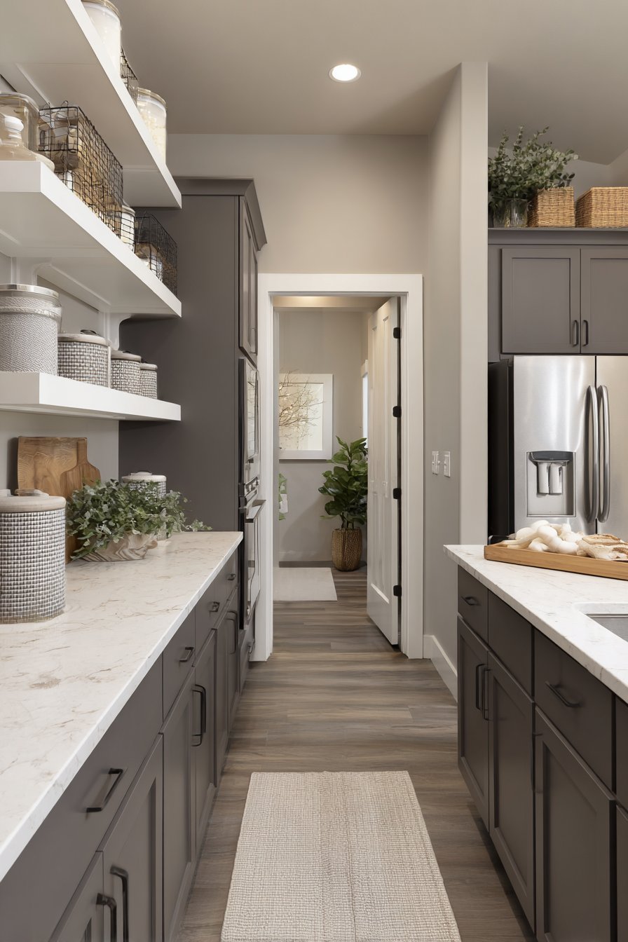Varying grey tones create visual interest throughout the space. The thirty-two-inch corridor demonstrates sophisticated color layering. Dove grey walls complement darker charcoal lower cabinets. Light grey open shelving above maintains tonal cohesion. Stainless steel wire baskets add metallic grey accents.