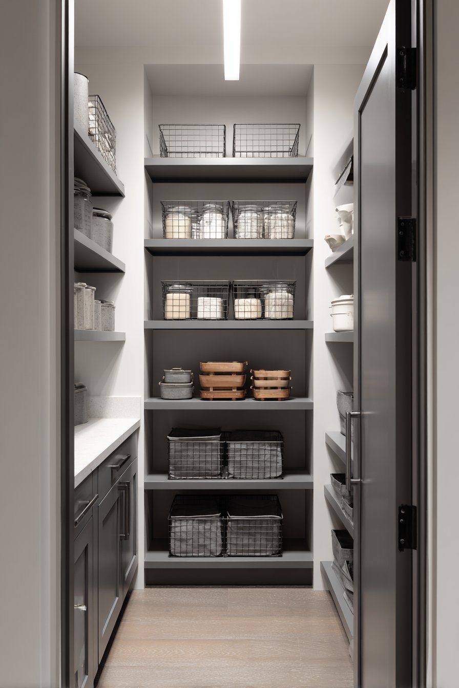 Professional photography showcases sophisticated grey tone layering. Soft diffused lighting reveals subtle color variations beautifully. The sleek contemporary organization feels modern and clean. Monochromatic design creates calm, cohesive atmosphere throughout. This pantry proves one color family offers endless possibilities.
