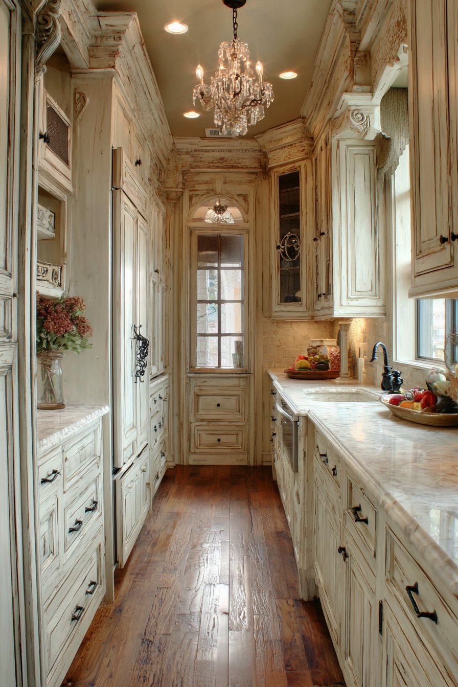 Distressed cream-colored cabinetry brings authentic French charm. Wrought iron details add traditional provincial character throughout. The thirty-four-inch space evokes countryside elegance beautifully. Chicken wire cabinet fronts allow visibility while adding texture. Vintage-style pull-out bins organize with old-world appeal.