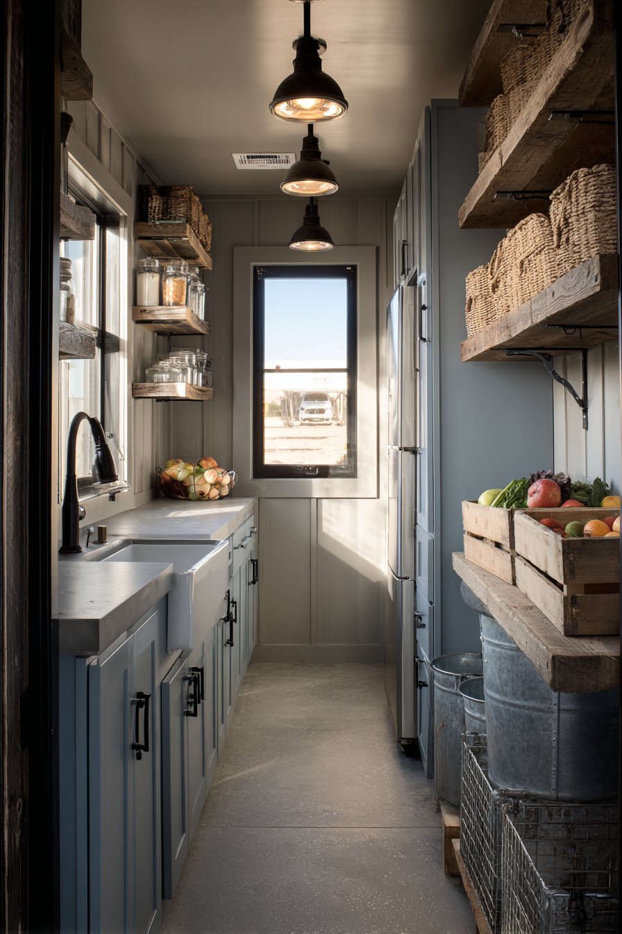 Shaker-style cabinets in muted blue-grey provide farmhouse foundation. Reclaimed pine open shelving adds authentic rustic character. The thirty-six-inch corridor balances modern and traditional elements. Galvanized metal bins store items with industrial farmhouse appeal. Enamelware canisters add vintage kitchen nostalgia beautifully.