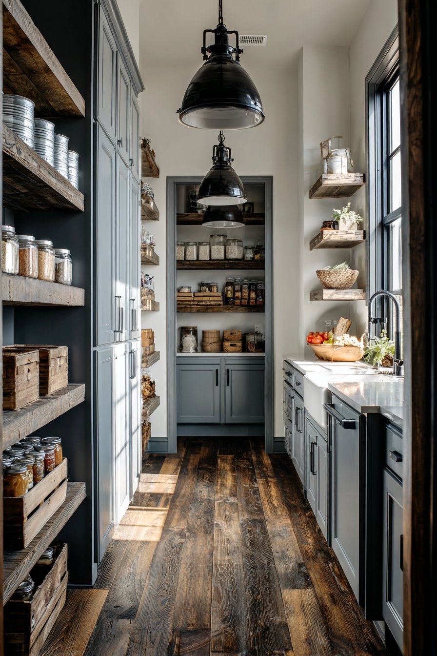 Interior design photography captures farmhouse materials with natural morning light. The authentic lived-in functional aesthetic feels welcoming. Reclaimed wood brings sustainability to beautiful design. The modern farmhouse style remains popular for good reason. This pantry demonstrates the style’s enduring appeal.