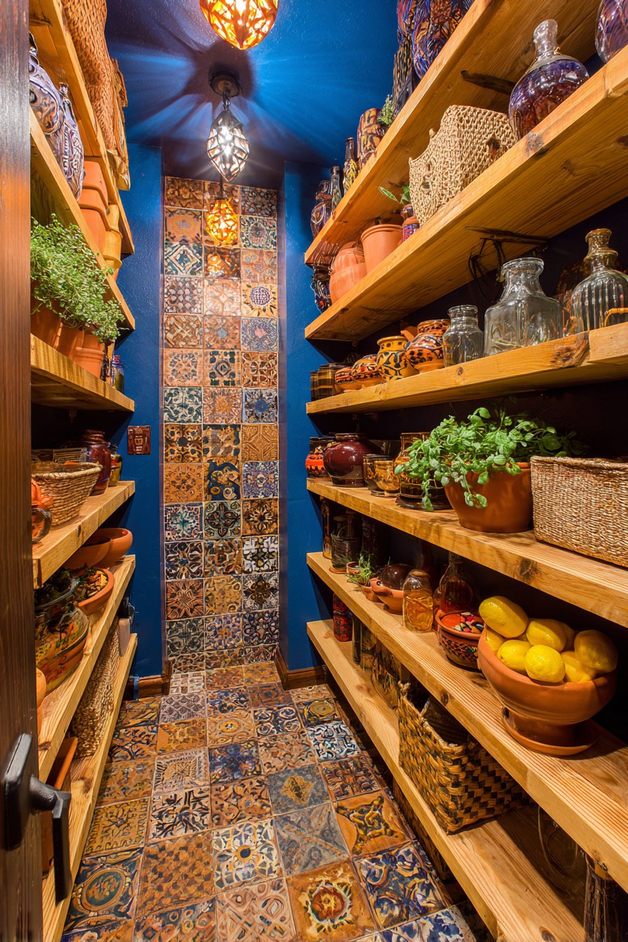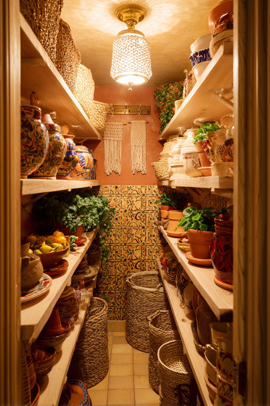 Professional photography uses golden hour light beautifully. Layered textures and collected aesthetic shine in warm illumination. The bohemian style celebrates individual expression freely. No two bohemian pantries look identical by nature. This design encourages creativity and personal curation.