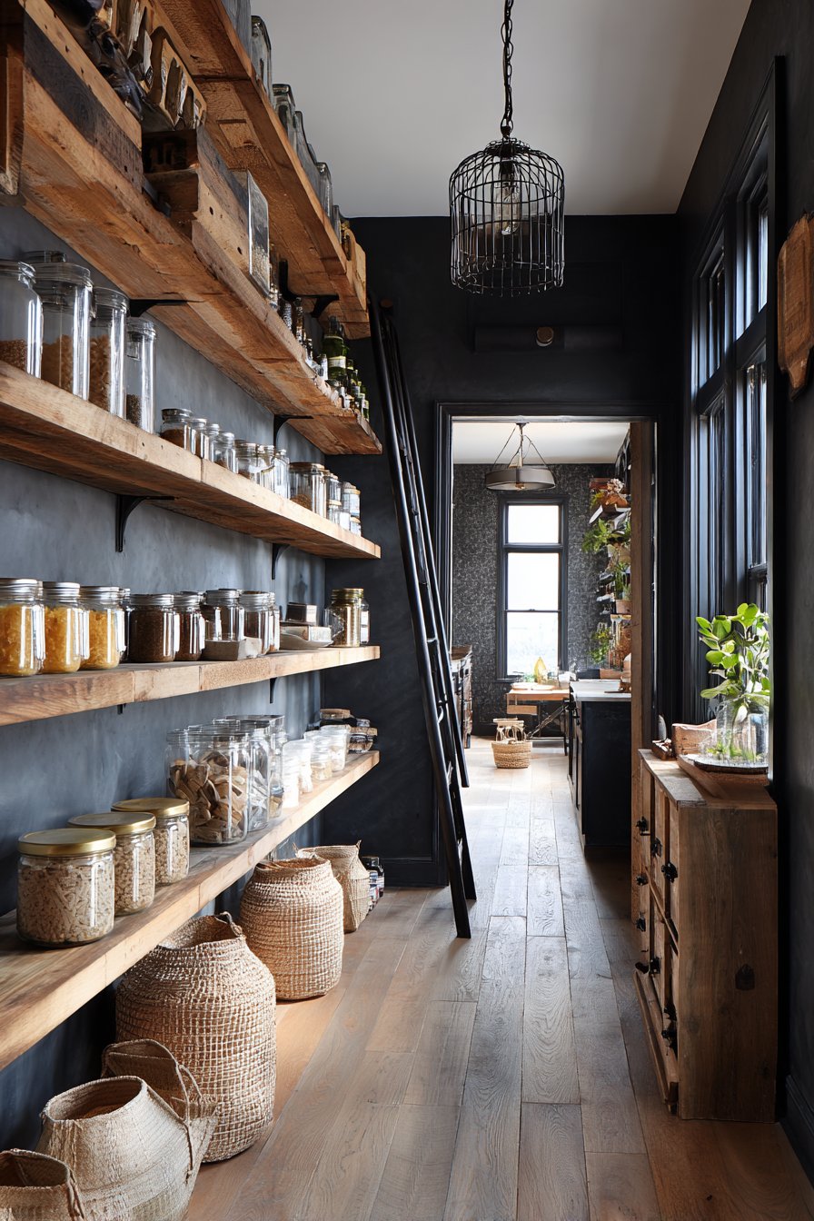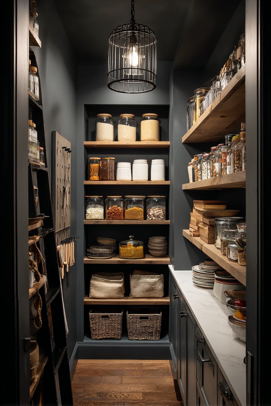 Deep charcoal grey walls create dramatic contrast with natural wood shelving. The thirty-inch wide space features floating shelves at varied heights. This irregular arrangement accommodates different storage needs. A pegboard system on one wall hangs utensils and lightweight items. The flexible configuration adapts as needs change over time.